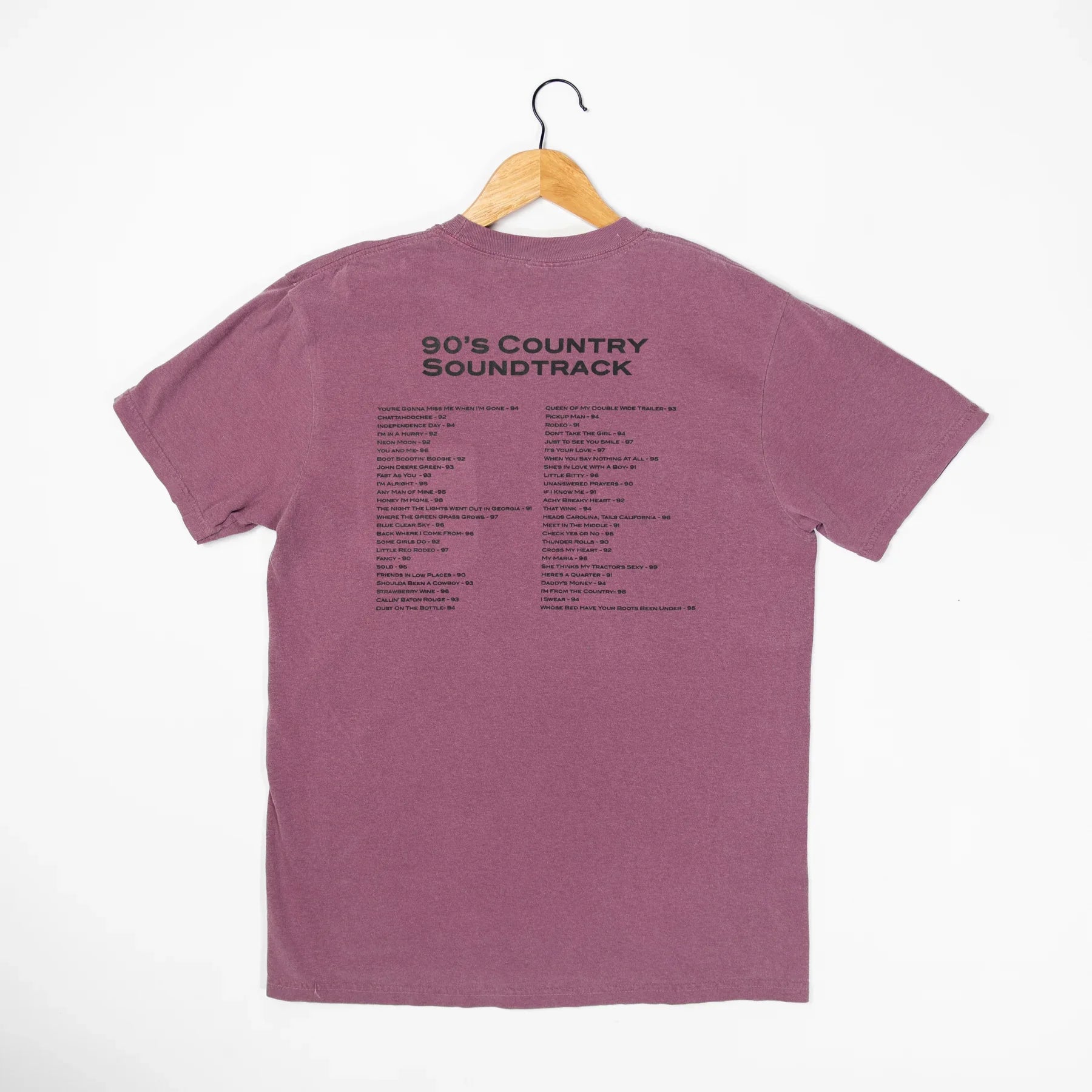 Relive the golden era of country music with our '90's Country Soundtrack' Dark Mauve Pocket Tee. This unique tee combines the classic style of 90s country with a modern, relaxed fit, making it perfect for today's farm girl. Crafted from 100% cotton for ultimate comfort and durability, this dark mauve colored shirt features unisex sizing, ensuring a great fit for everyone. The detailed soundtrack list printed on the back adds a nostalgic touch, reminding you of the best country hits from the 90s. Whether you're out on the farm, enjoying a country concert, or just reminiscing about the good old days, this tee is a must-have for any 90s country music fan. Fast shipping means you won't have to wait long to show off your love for a timeless musical era. Shop online now and add a piece of country music history to your wardrobe.