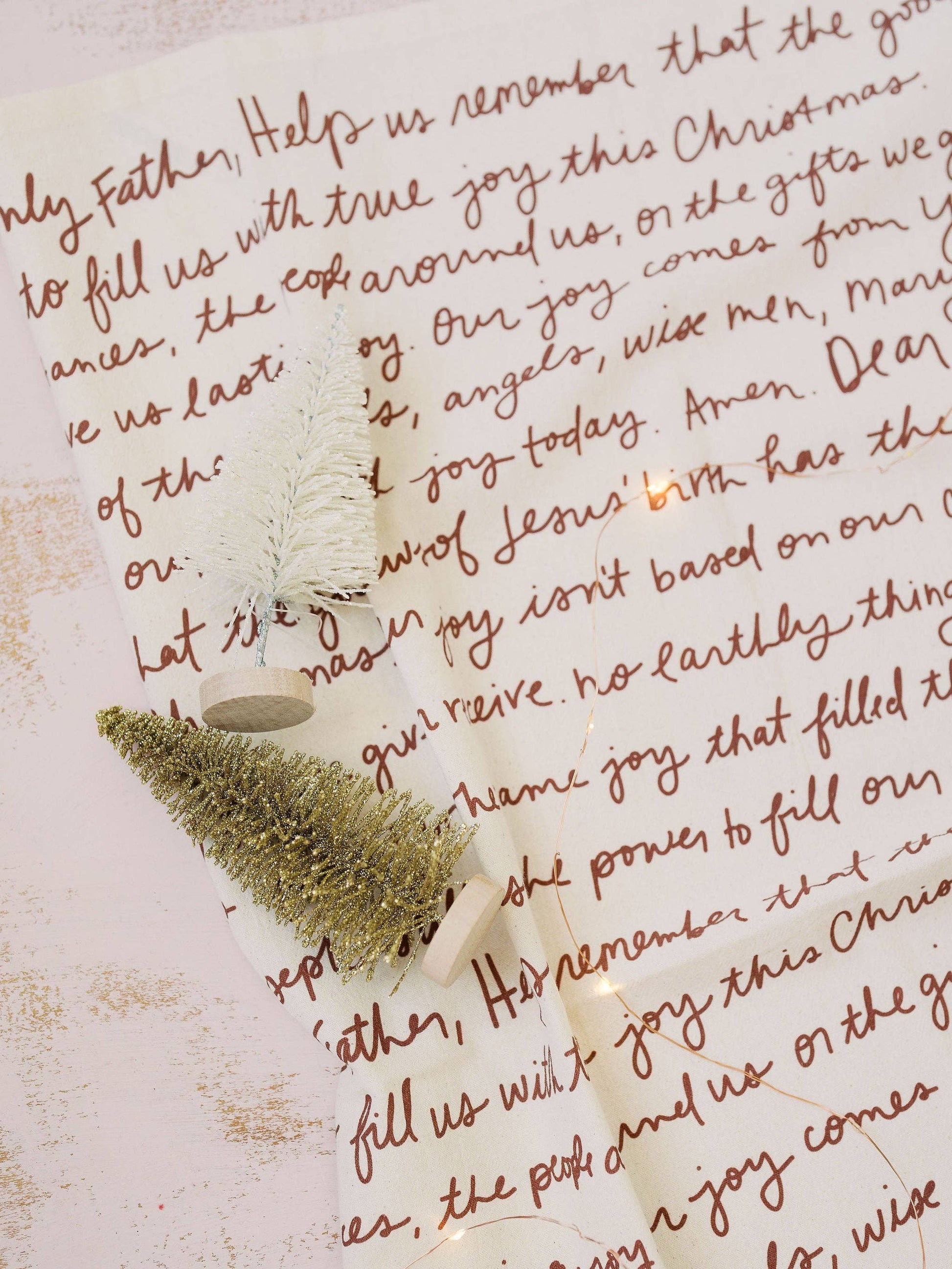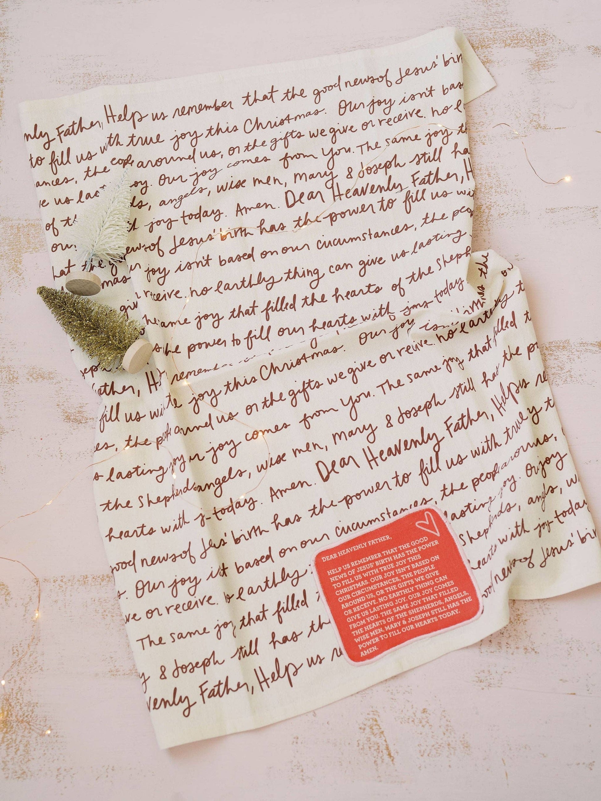 This charming white flour sack towel is adorned from corner to corner with a warm, hand-lettered prayer—a joyful nudge to keep the Good News close all season long. We adore the playful applique detail showcasing the full prayer, letting you savor these words throughout Christmas. Soft, durable, and brimming with heart, it’s ideal for gifting, decorating, or weaving into your holiday rituals. Because even amid the chaos, the miracle sparkles bright.