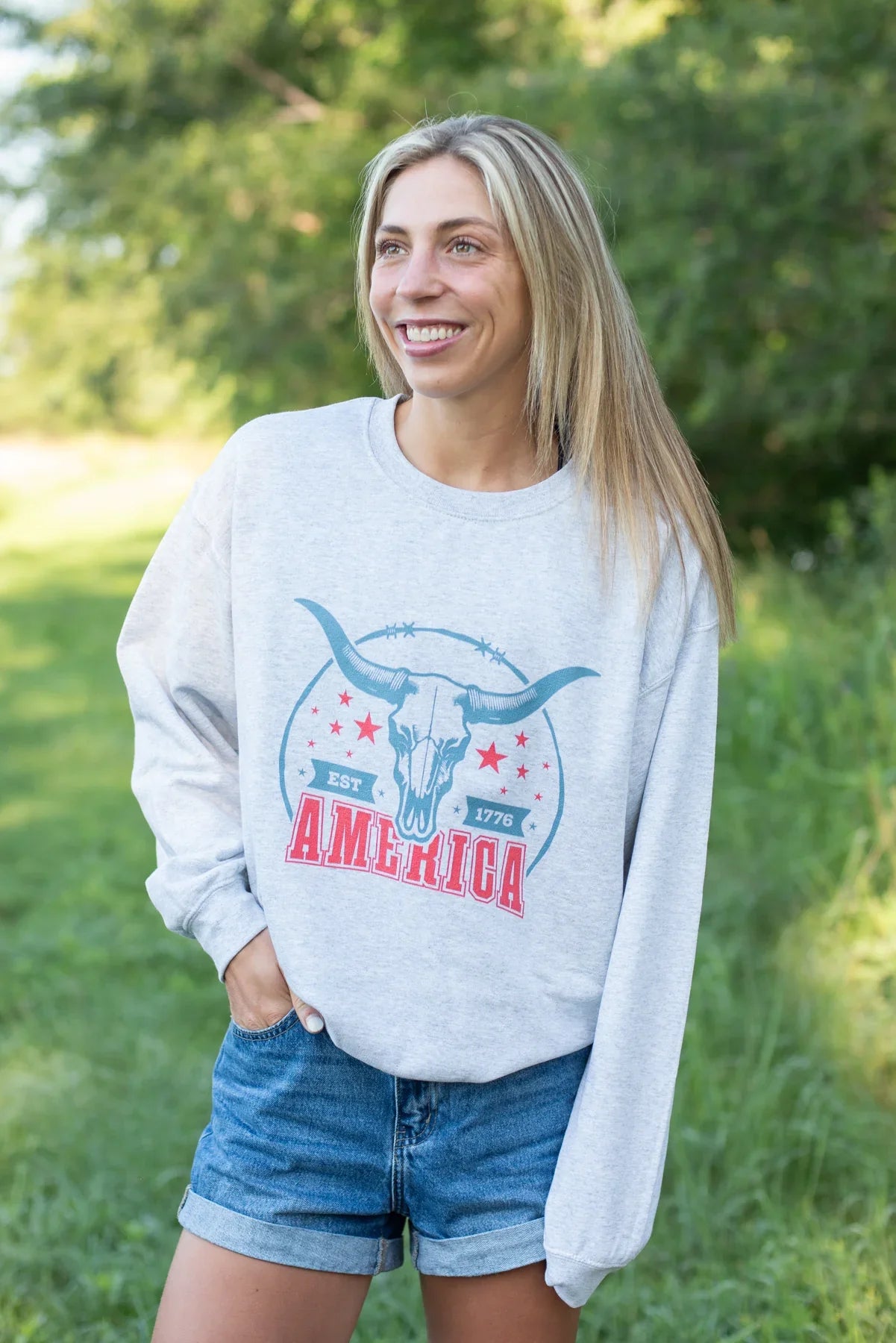 Show your patriotic spirit with this bold Ash Crewneck featuring 'AMERICA' in striking red letters below a blue horned skull graphic. Established 1776 design celebrates proud American heritage. Made with Gildan quality for comfort that lasts as long as your love for the red, white, and blue.