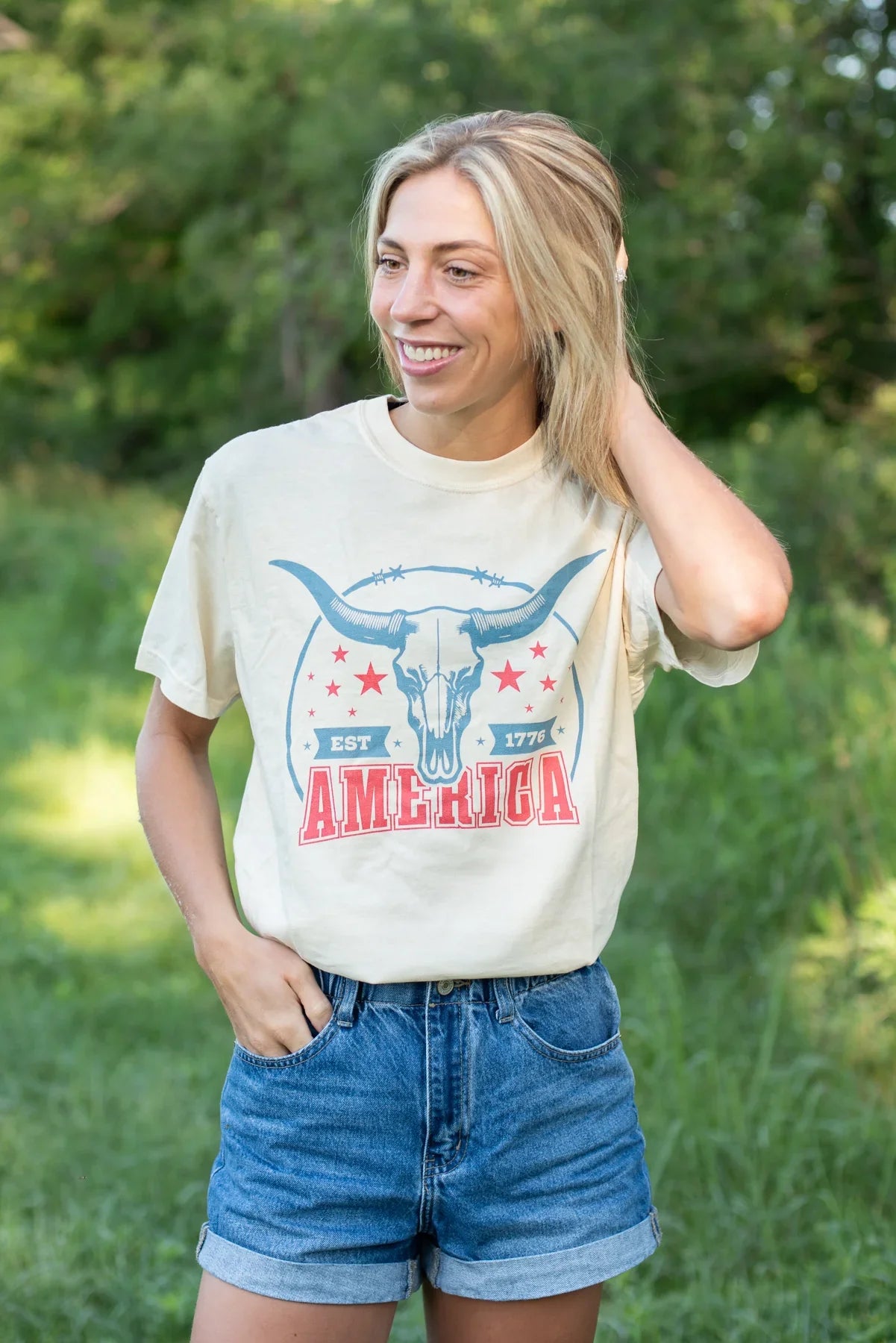 Show your patriotic spirit with our America Skull Ivory Tee. This eye-catching design features bold red "AMERICA" lettering below a striking blue horned skull graphic, proudly displaying "EST. 1776." Printed on premium Comfort Colors fabric, this ivory tee combines national pride with exceptional softness and durability that true Americans deserve.