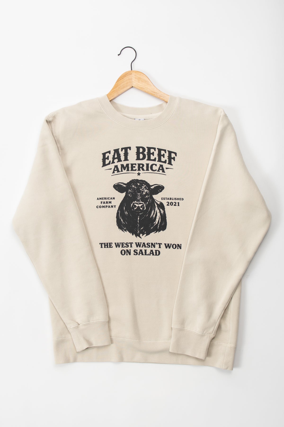 Wear your beef pride with this playful crewneck from Independent Trading Co. Featuring a bold black Angus graphic with the cheeky slogan "Eat Beef America" and "The West Wasn't Won on Salad," this cream-colored tee brings Western humor and agricultural spirit to your everyday style. Perfect for ranchers, beef lovers, and anyone who appreciates a good-natured jab at plant-based trends. Comfortable, durable, and conversation-starting.