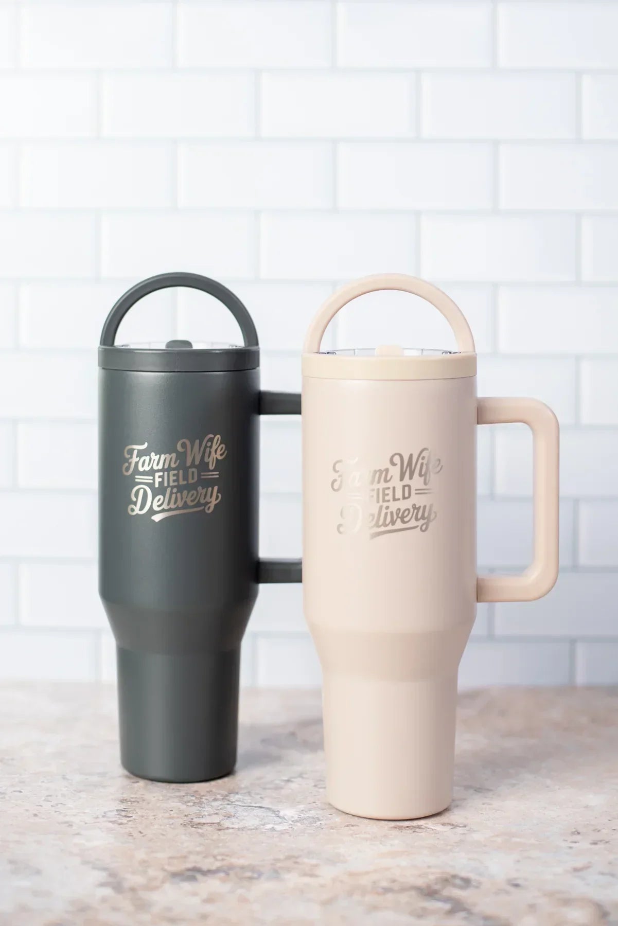 Stay hydrated in style with the "Farm Wife Field Delivery" Water Tank Tumbler. This 40oz cream-colored tumbler features playful script lettering, a convenient handle, and a flip-up top handle for easy carrying. Designed to fit most cupholders, it’s perfect for long days on the go—because your water should work as hard as you do.