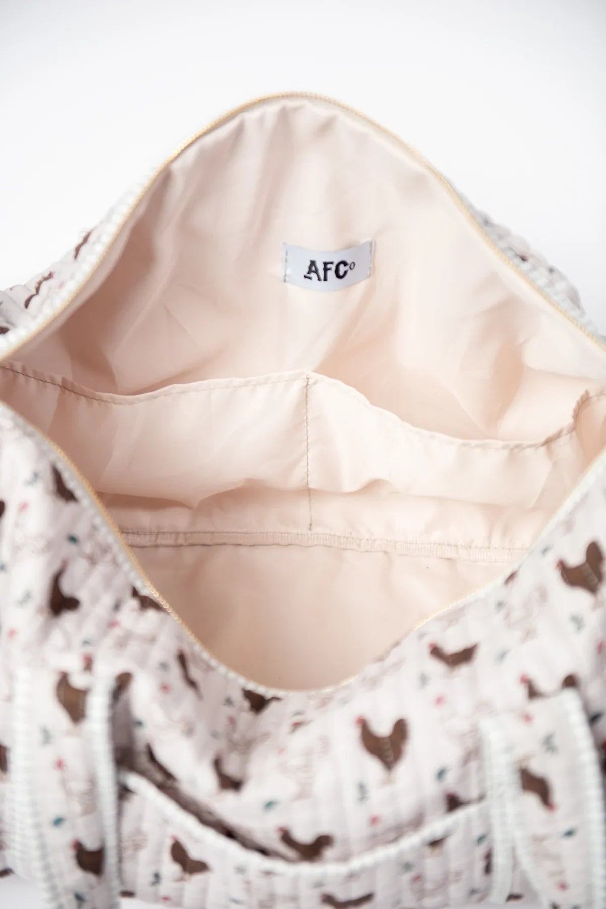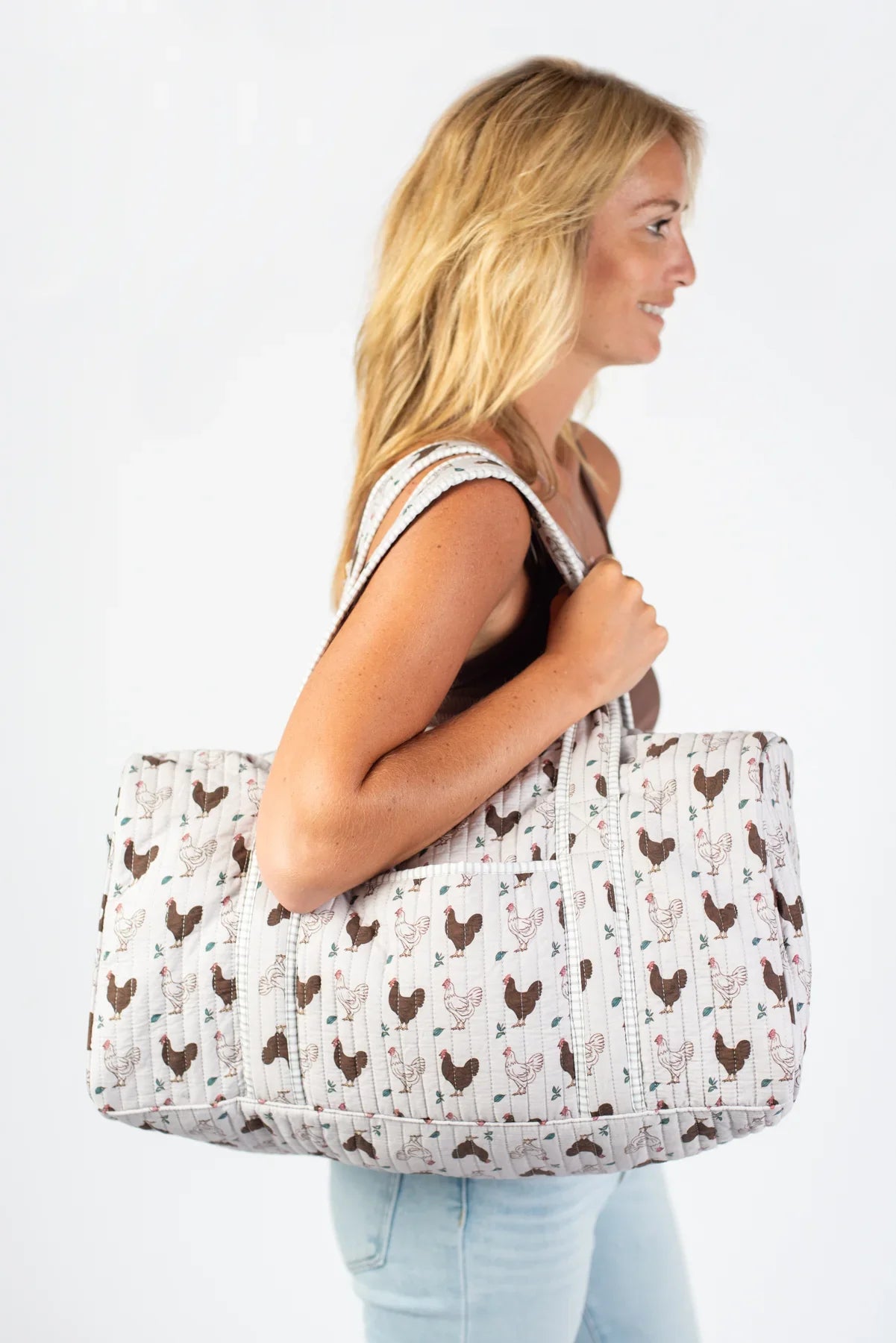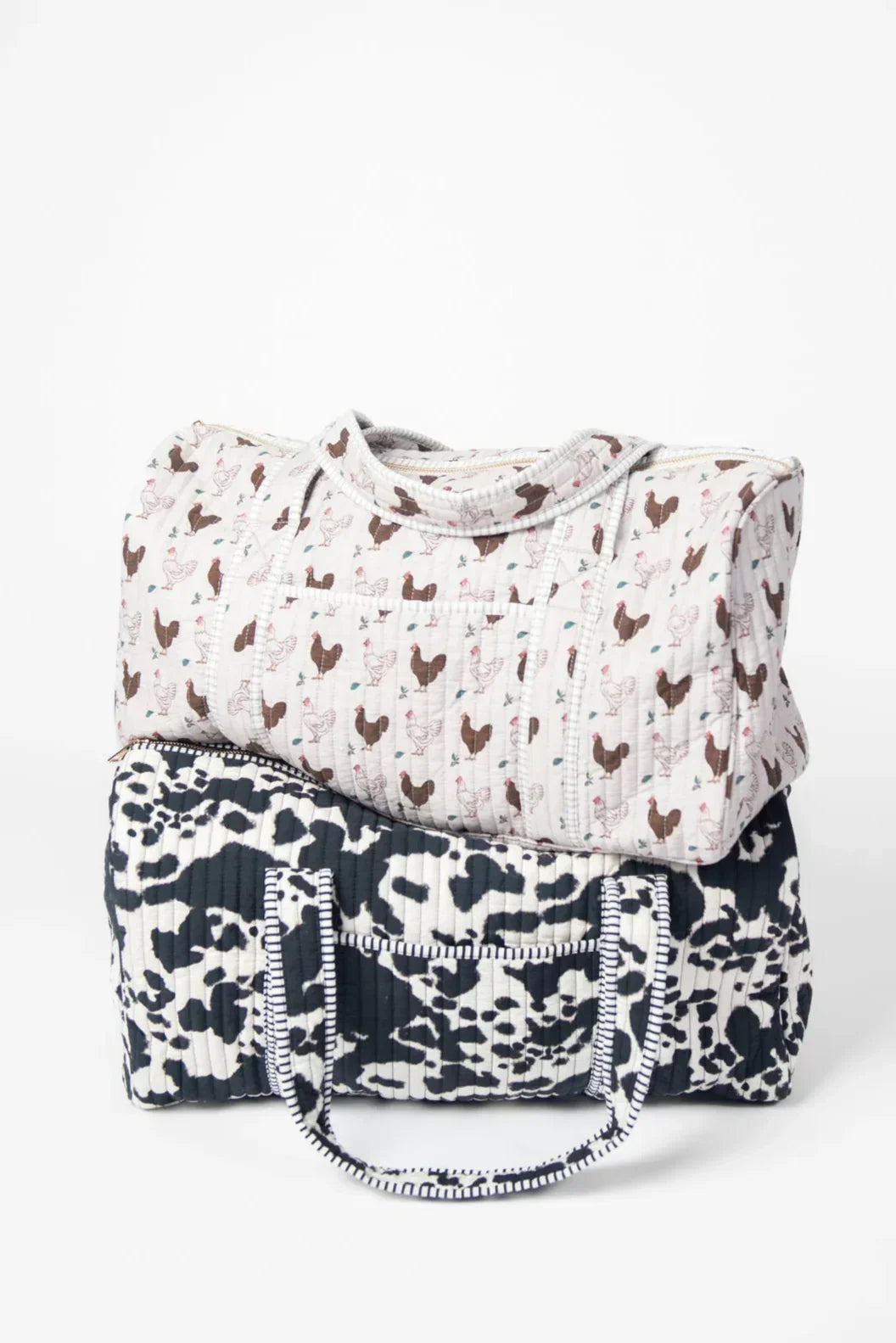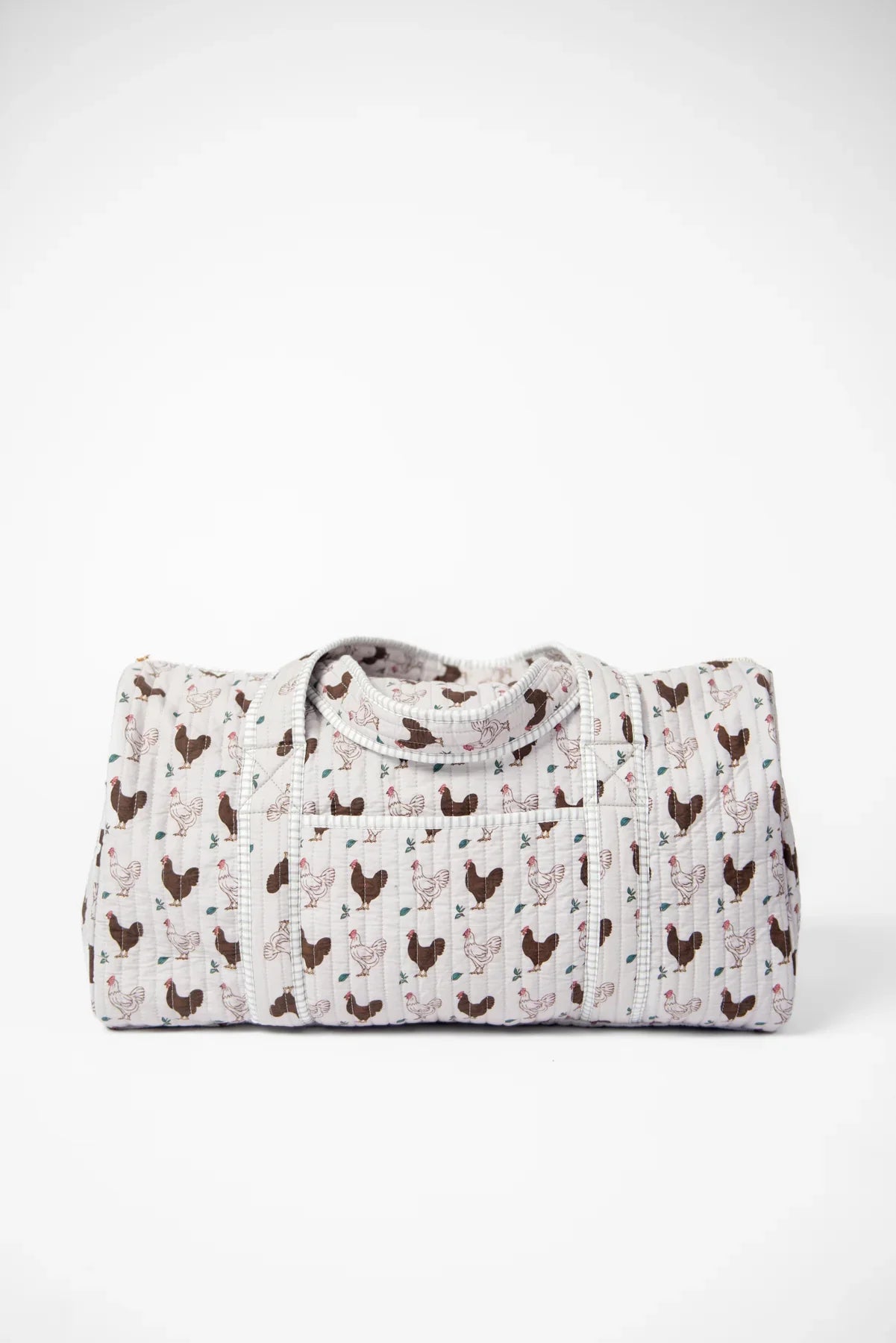 Carry your essentials in style with the Brown Chicken Quilted Duffle Bag, perfect for chicken lovers! Featuring a charming brown chicken design, this playful bag offers quilted comfort and durability. Stay organized with both exterior and interior pockets, while the gold zipper adds a touch of sparkle to your everyday adventures.