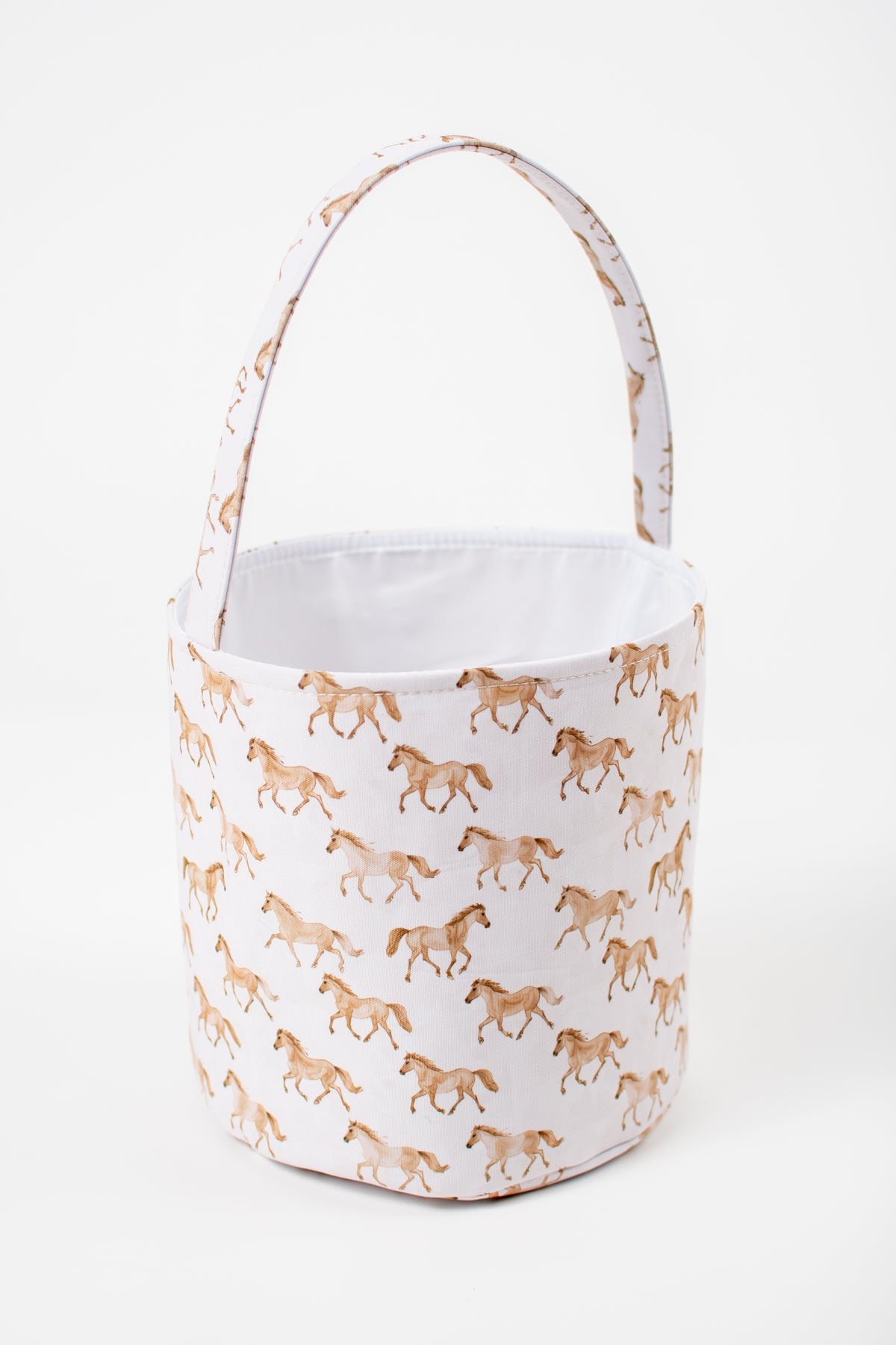 Saddle up for Easter with this spirited basket featuring majestic brown horses in a charming design. Measuring 8.5" x 7.75", it offers plenty of room for holiday treats, decorative grass, and springtime surprises. Made from resilient polyester fabric with a soft white lining, this basket is built to last through seasons of celebrations. Perfect for equestrian enthusiasts and anyone who loves a touch of pastoral whimsy.