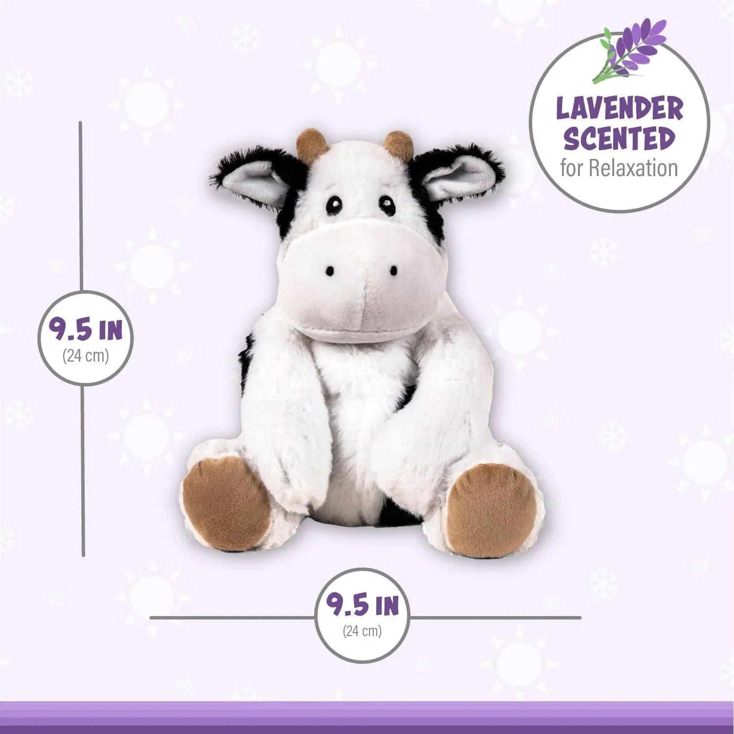Callie Cow Warm Pal is your snuggly companion ready to offer a cozy hug whenever you need it. Packed with natural grains and plush stuffing, it can keep you warm or cool, just the way you like. Infused with soothing lavender, it helps calm your mind. Pop it in the microwave for 60-90 seconds or chill it in the freezer, then enjoy the relaxing comfort of your new Warm Pal friend.