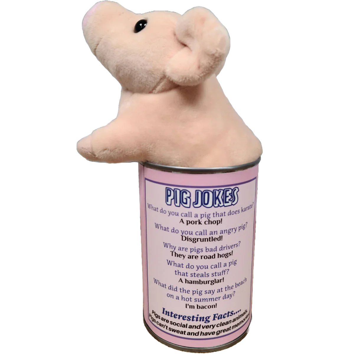 Discover Cupcake the Canned Pig! Inside each can, you'll find a soft, 5-inch plush pig along with some hilarious pig jokes and a fun fact printed right on the can. These unique cans are a hit with both kids and grown-ups. How many can say they've ever gotten a Canned Pig? It's a quirky surprise sure to bring smiles!