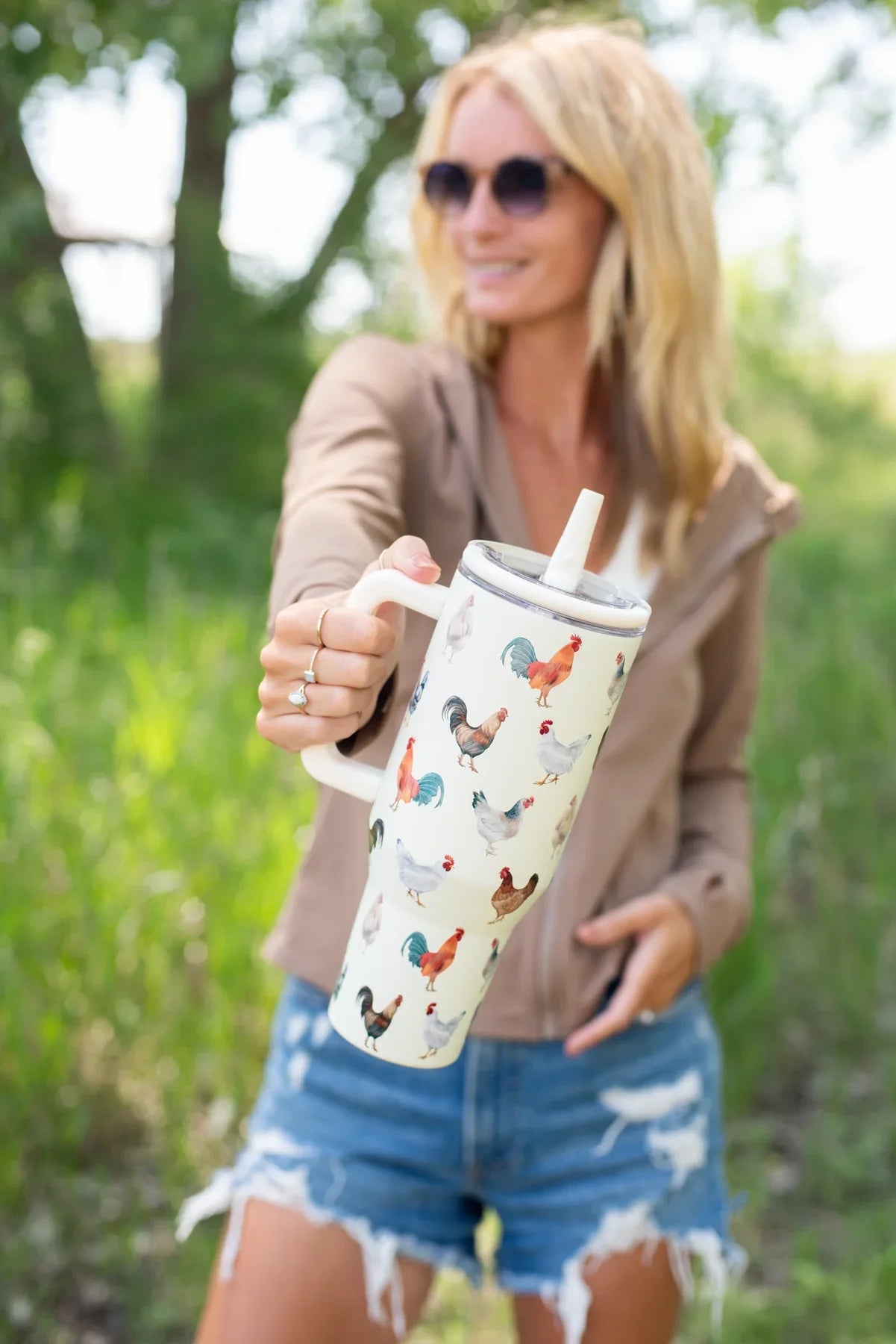 Quench your thirst in farmhouse style with this charming 40oz insulated stainless steel tumbler featuring adorable chickens on cream background. The ergonomic handle provides comfortable carrying, while the leakproof twist-on lid with flip-up handle prevents spills on the go. Designed with convenience in mind, its narrow bottom fits standard cupholders perfectly. Enjoy your favorite beverages at ideal temperatures all day long – hot or cold!