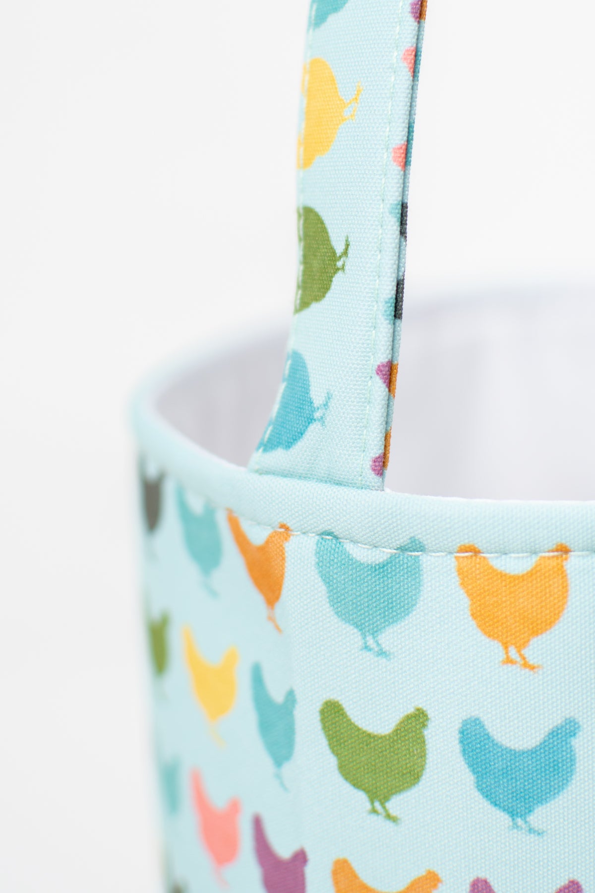Hop into spring with this charming Easter basket featuring a vibrant colorful chickens design. Measuring 8.5" x 7.75", it's the perfect size for filling with eggs, treats, and seasonal surprises. Crafted from durable polyester fabric with a crisp white lining, this basket combines festive style with everyday durability. Ideal for holiday displays, gift-giving, or adding a cheerful touch to your seasonal décor.