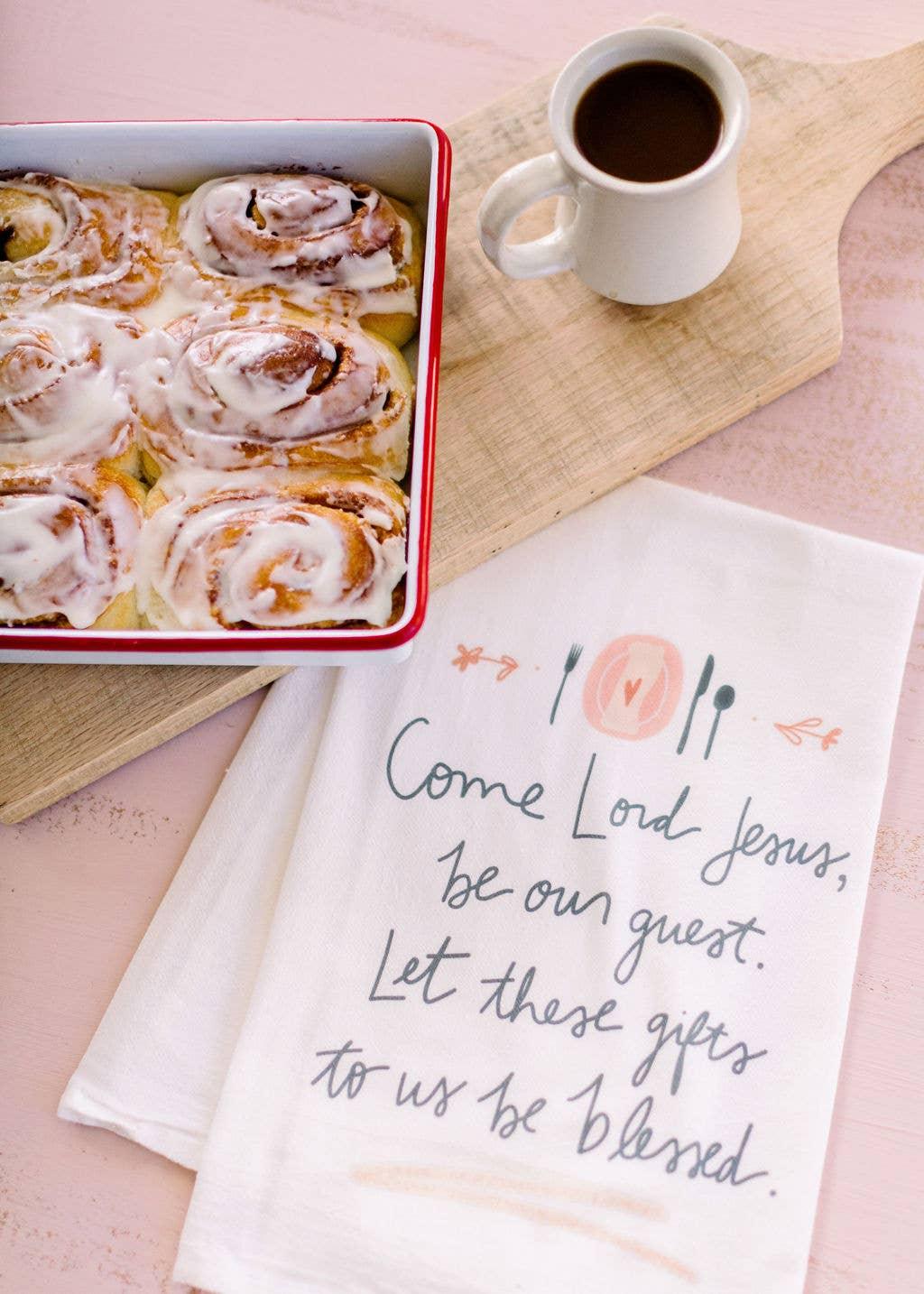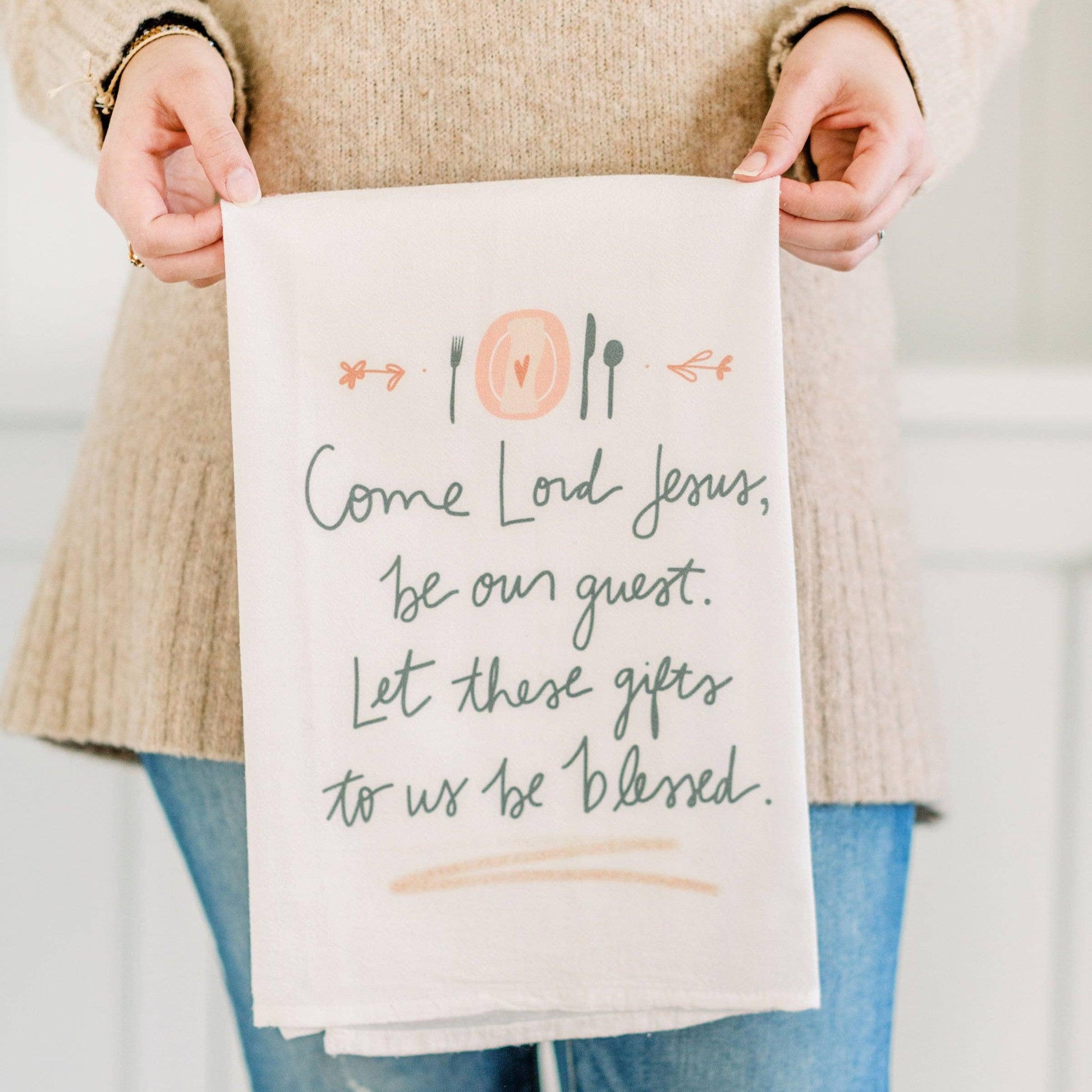 Add a touch of spiritual charm to your kitchen with the 'Come Lord Jesus' Flour Sack Towel. Featuring peach and sage colored lettering, this cream fabric towel is a unique and playful reminder to invite the Lord into your home and bless your guests' gifts.