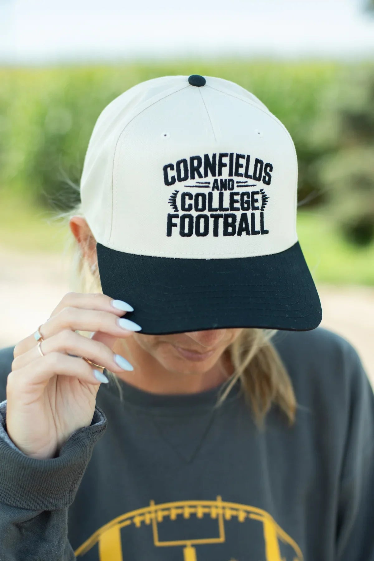 Show your love for fall traditions with this playful trucker hat featuring "corn fields & college football" embroidered in football-shaped letters. Perfect for game days or casual outings, its breathable mesh back keeps you cool while the structured front lets your style score big. This hat is a fun way to celebrate your favorite season and sport in one bold look.