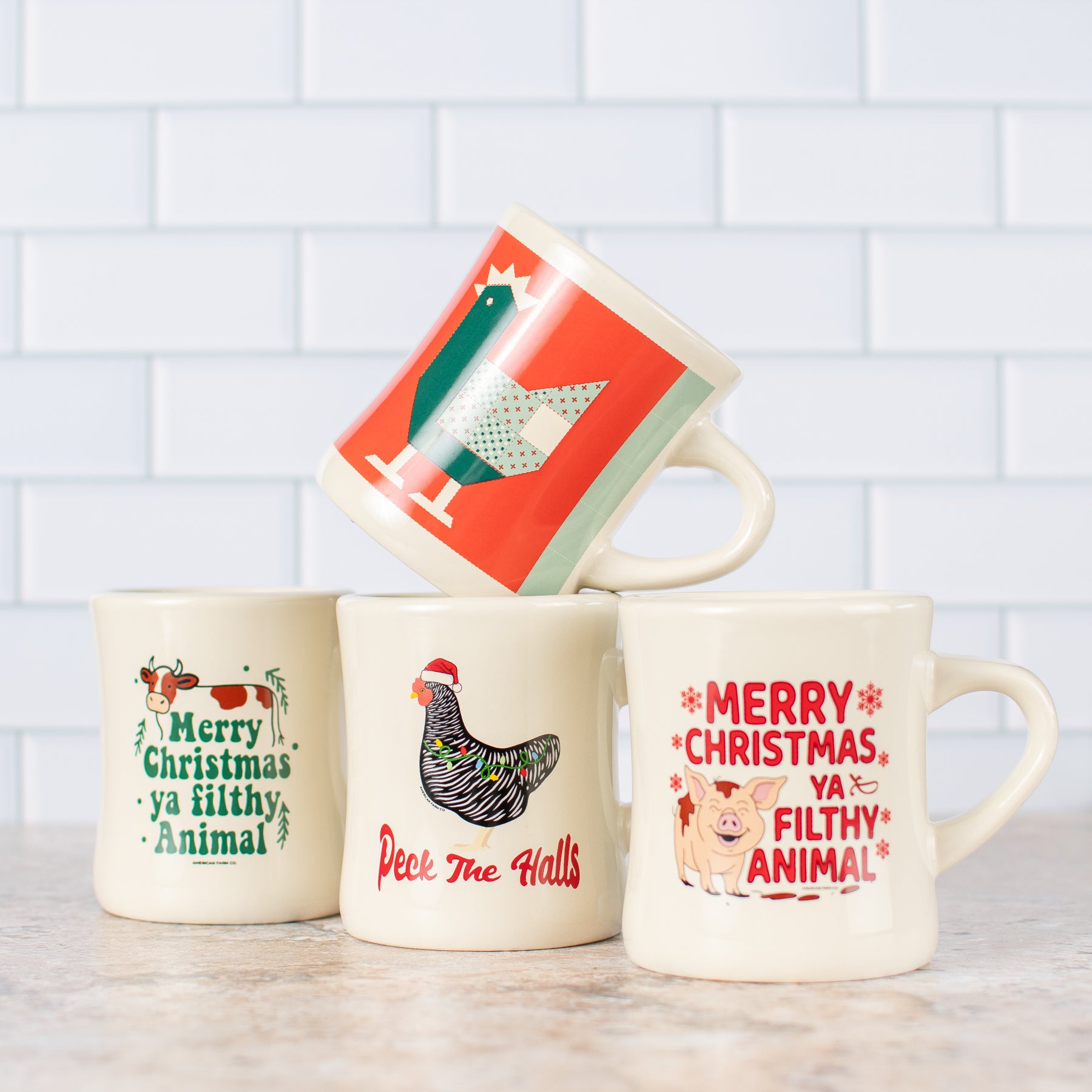 Start your mornings with a smile using this playful 12 oz ceramic diner mug. Featuring a festive cow graphic and the cheeky phrase "Merry Christmas Ya Filthy Animal," it’s perfect for holiday coffee, cocoa, or tea. Durable and charming, this mug brings fun and festive cheer to every sip.