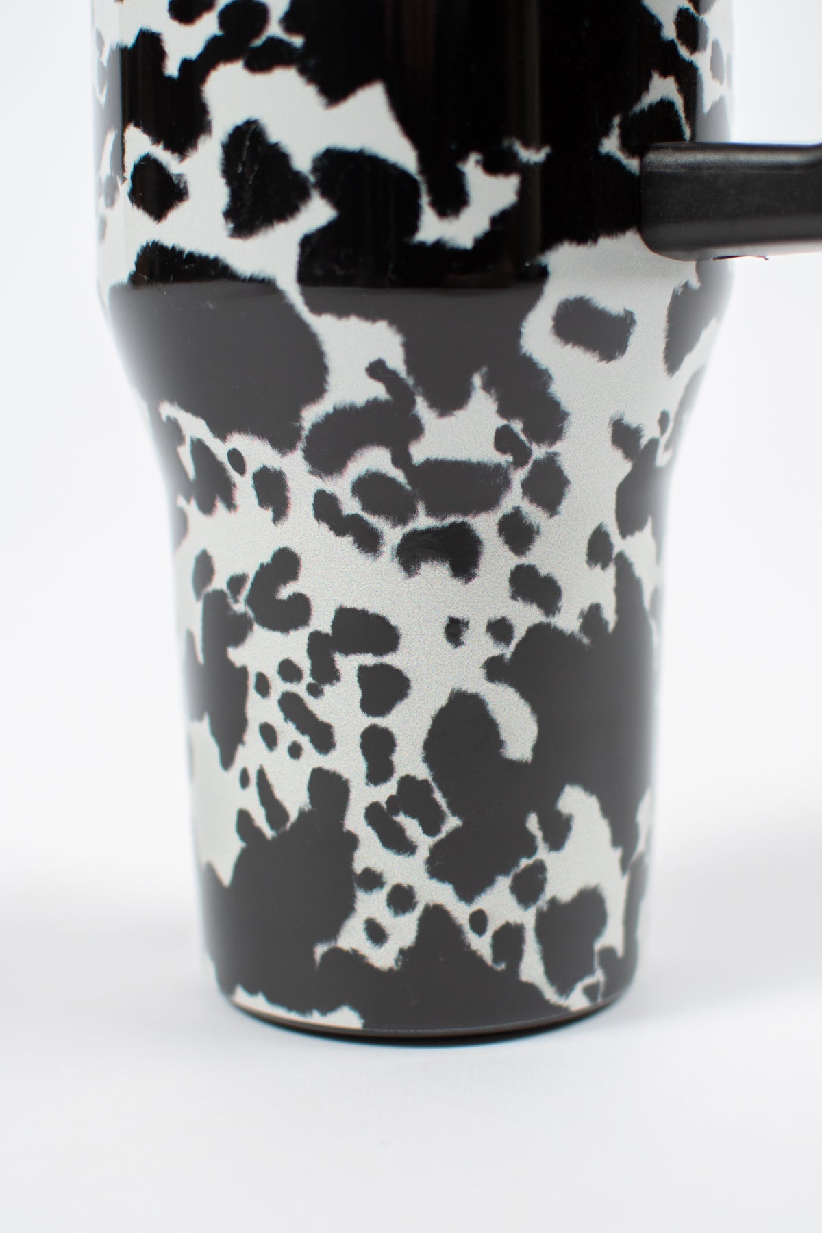 Stay hydrated in style with this eye-catching 40oz Cow Print Water Tank Tumbler. Featuring a convenient handle and twist-on lid with flip-up drinking spout, this leakproof tumbler keeps beverages at the perfect temperature for hours. The sleek narrow bottom fits standard cupholders while the durable insulated stainless steel construction ensures long-lasting performance. The classic black and white cow spot design adds a playful touch to your everyday hydration routine.