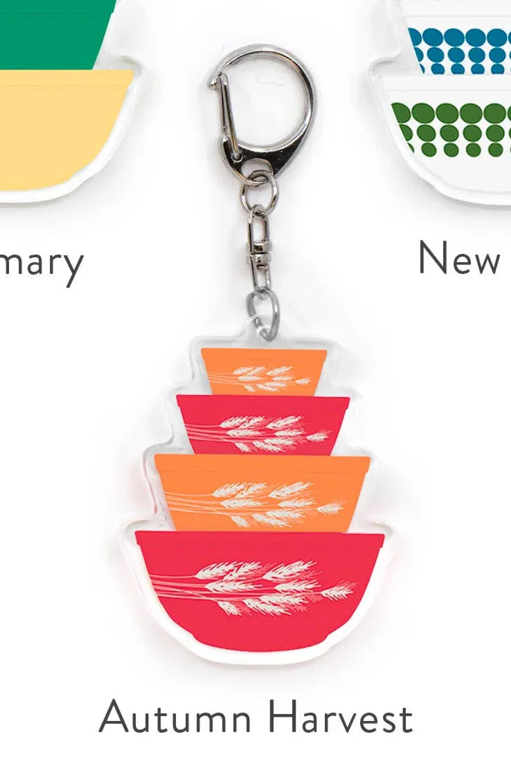 These sturdy double-sided keychains crafted from clear acrylic showcase a colorful stack of vintage Pyrex mixing bowls. Perfect for collectors and fans of retro kitchens, they add a playful and practical touch to your keys.