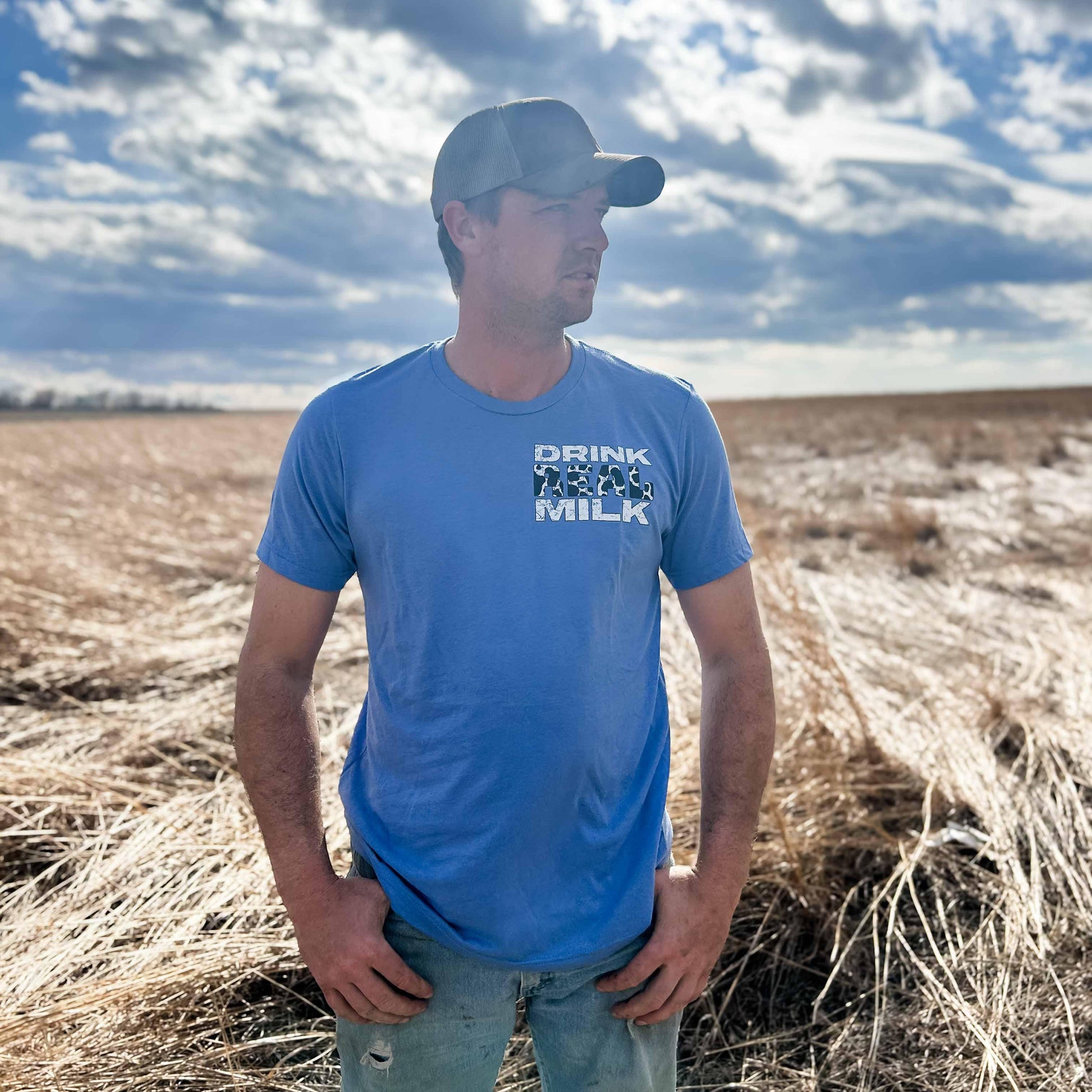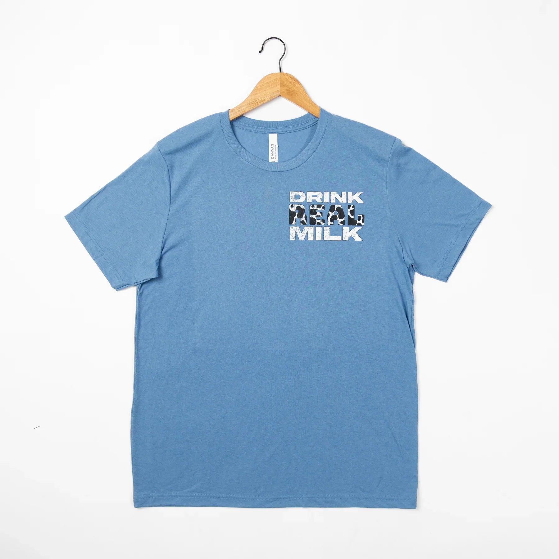 Stay cool and comfy in our 'Drink Real Milk' Blue Tee! Made with soft Bella Canvas fabric and featuring cow spot lettering in a calming lavender blue color, this tee is perfect for any casual occasion. Plus, it's our June Tee of the Month, so grab one for just $20 and show your love for real milk!