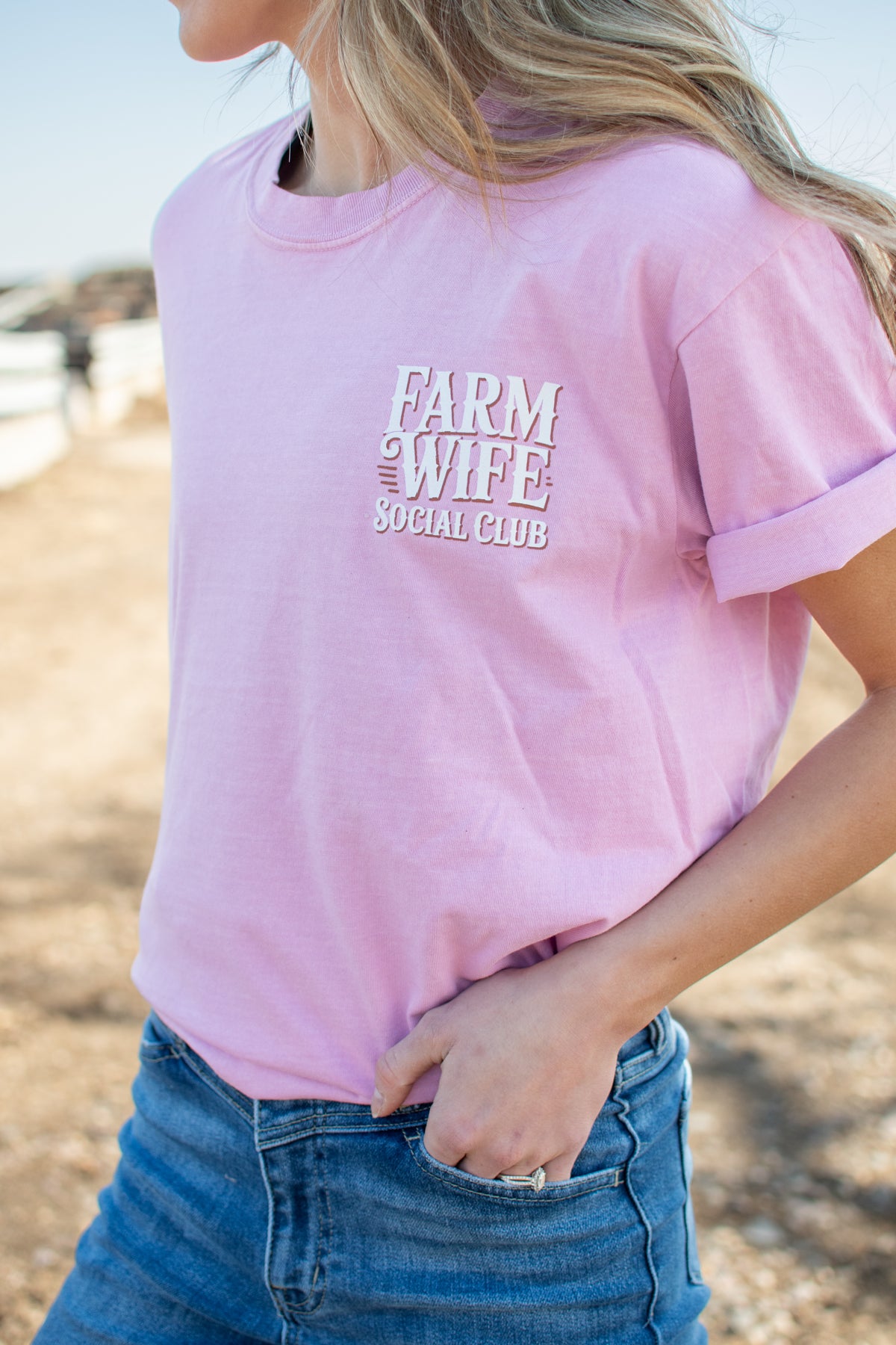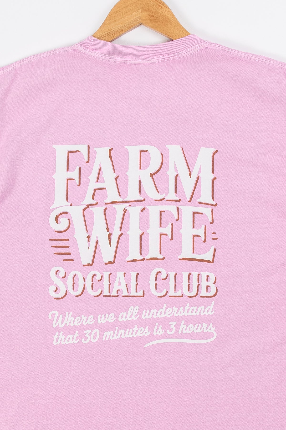 Celebrate the laid-back life with the 'Farm Wife Social Club' purple tee. Featuring a large, playful graphic on the back and a cheeky slogan—"where we all understand 30 minutes is 3 hours"—this comfortable Comfort Colors shirt is perfect for those who know farm life’s unique rhythm. Soft, durable, and designed for everyday wear, it’s a fun way to show your farm wife pride with a wink.