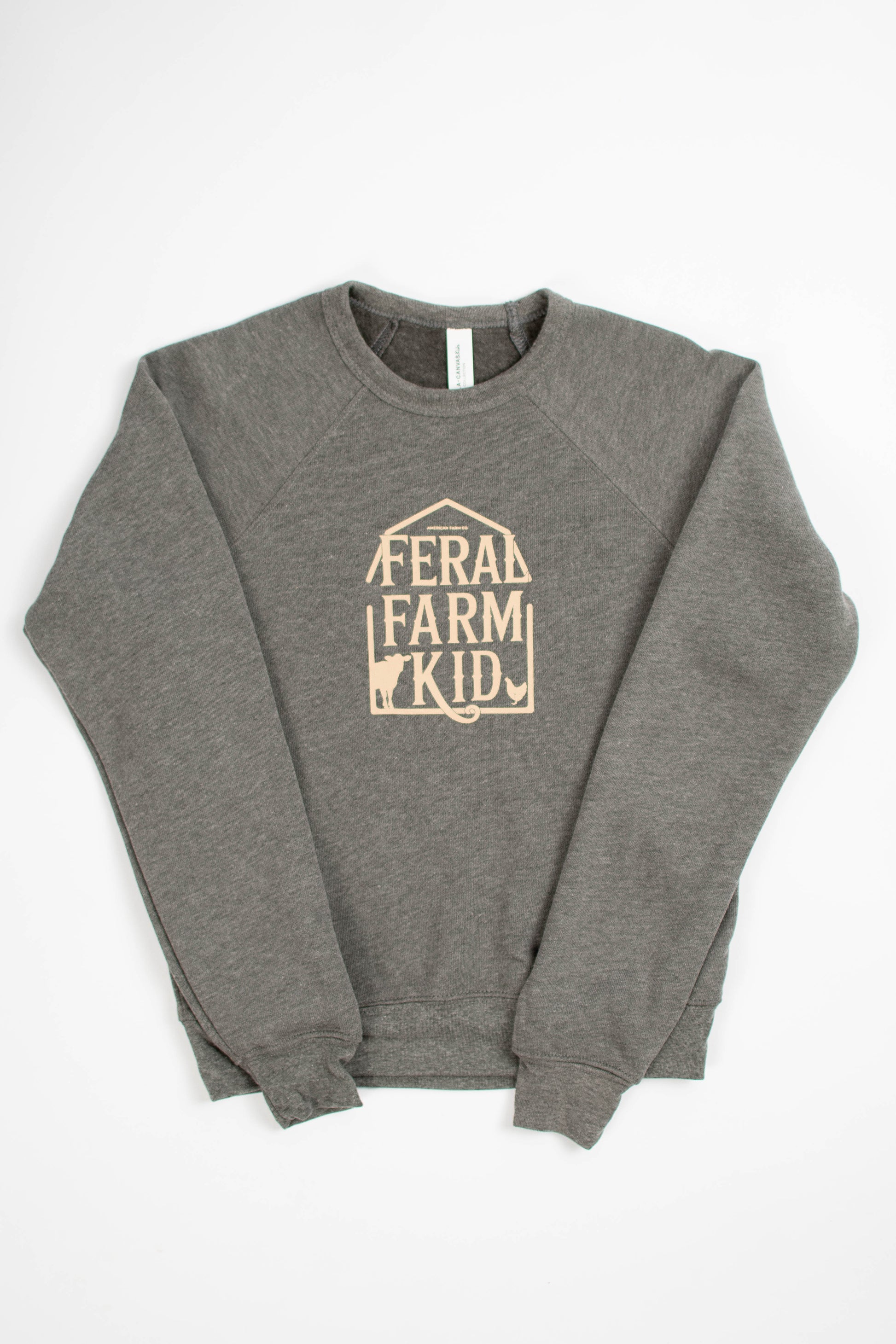 Celebrate the wild spirit of childhood with this 'Feral Farm Kid' crewneck. Featuring a fun barn-shaped outline in warm tan hues, it's perfect for toddlers and youth who love life on the farm. Crafted from soft Bella+Canvas fabric in a cozy charcoal shade, this crewneck keeps little ones comfortable and stylish all day long. Ideal for playful adventures and everyday wear.