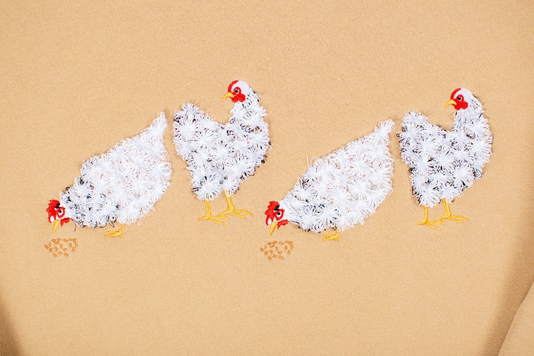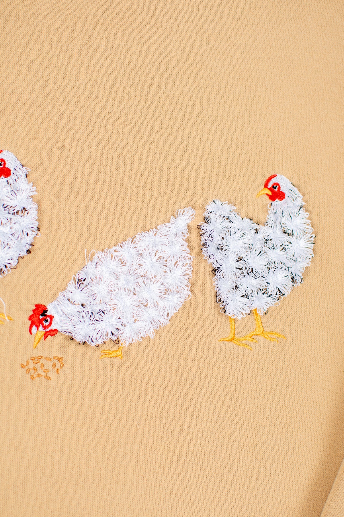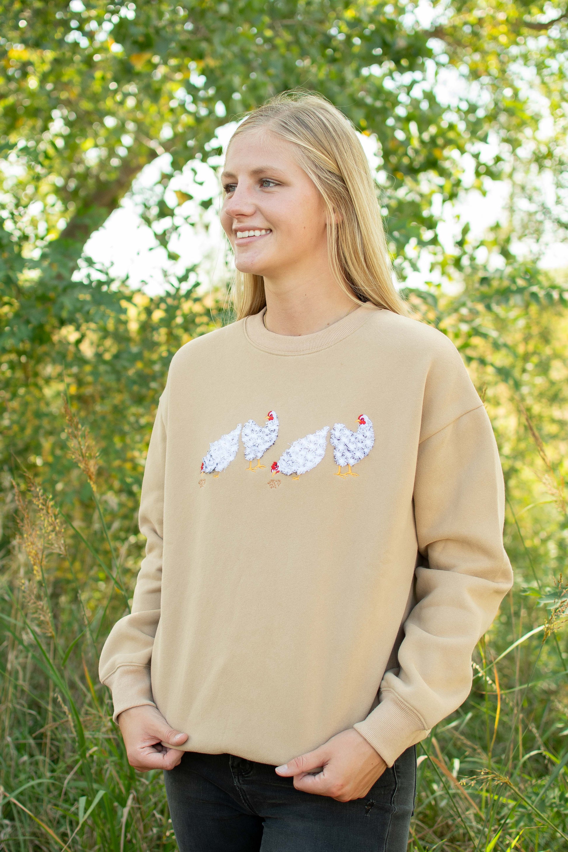 This cozy tan crewneck features four fluffy white chickens embroidered with playful charm. Perfect for anyone who loves a touch of farmyard fun, it’s soft, comfortable, and sure to brighten your day with every wear.