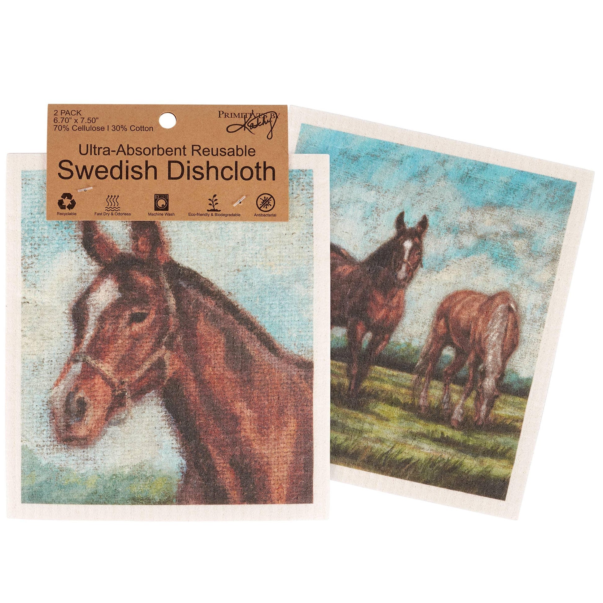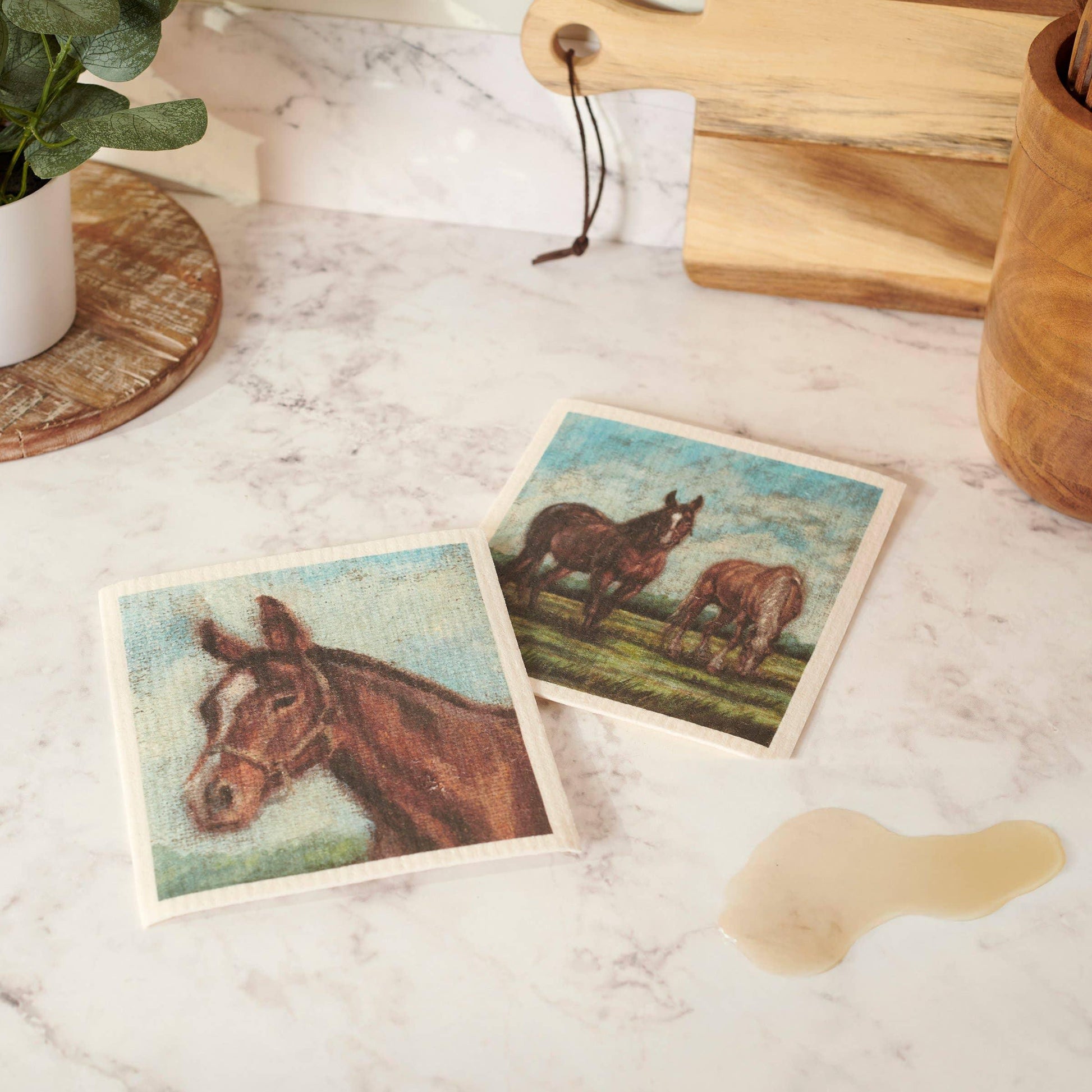 These ultra-absorbent Swedish Dishcloths, featuring charming scenes of grazing horses, are a must-have for any horse lover! Not only are they safe for all surfaces and eco-friendly, but they also have antibacterial properties. And with a convenient set of 2, you'll always have one available - just toss them in the machine when they need a wash!