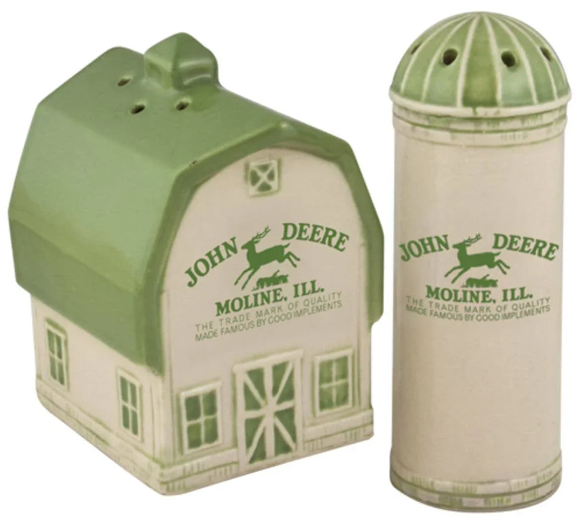 Bring a touch of farmyard charm to your table with this John Deere Vintage Barn & Silo Salt & Pepper Set. Crafted from sculpted stoneware, each piece features a classic barn and silo adorned with vintage John Deere logos. Easy-to-remove stoppers on the bottom make refilling and cleaning a breeze. Perfect for adding a playful, rustic vibe to your meals!