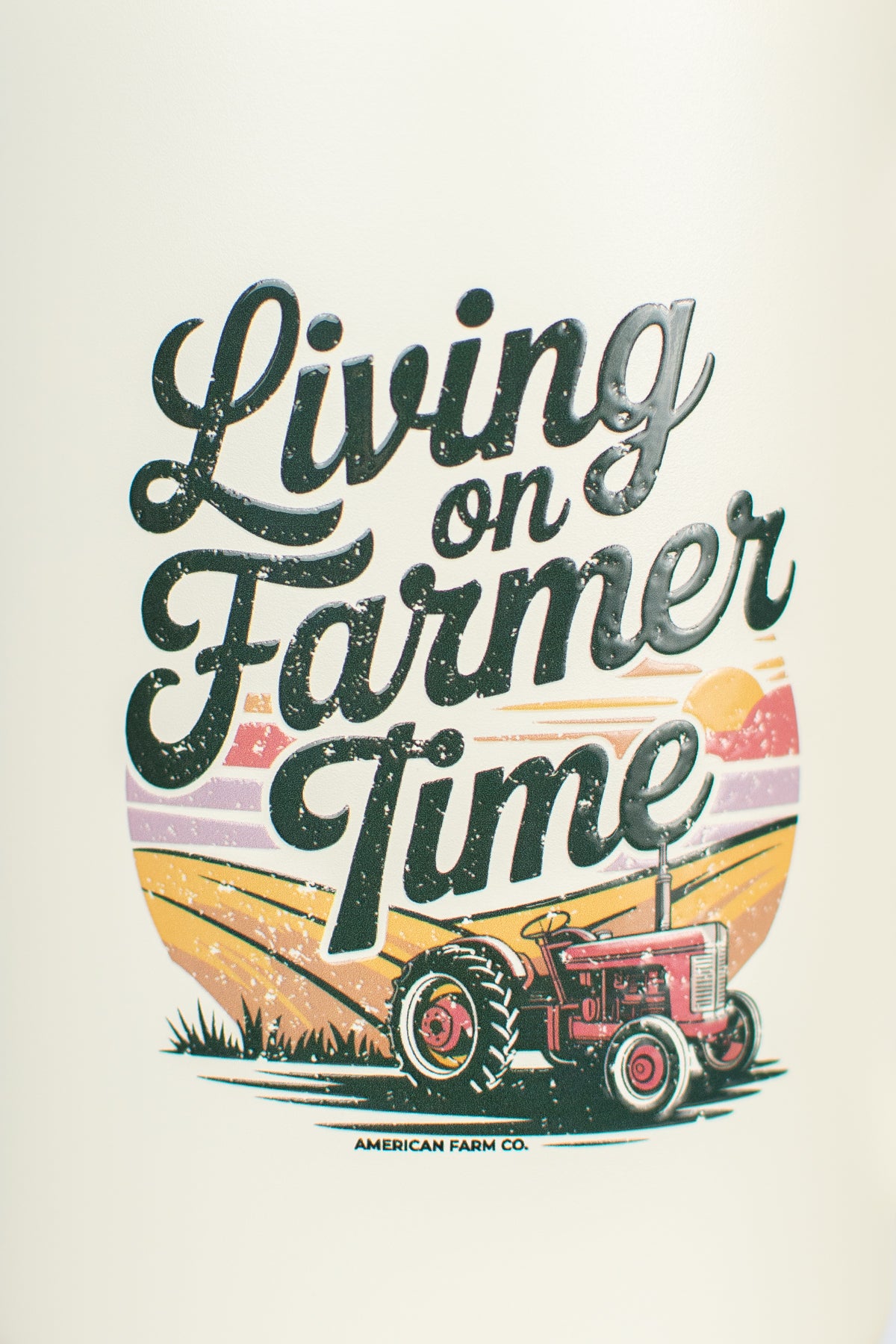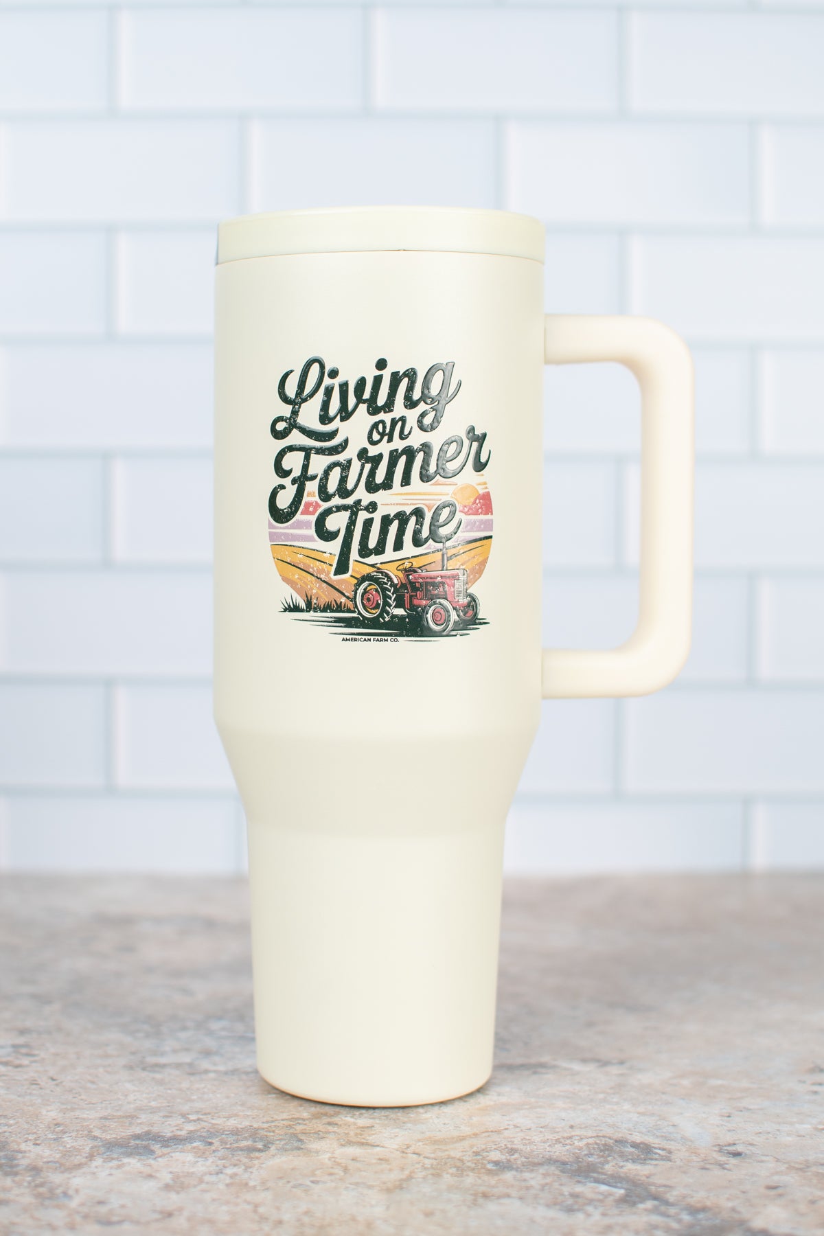 Stay refreshed and stylish with the 'Livin on Farmer Time' 40oz Water Tank Tumbler. This ivory insulated stainless steel tumbler keeps drinks hot or cold all day long. Featuring a playful farm field scene with a red tractor and script text, it’s perfect for anyone who loves life on the farm. The twist-on, leakproof lid includes a flip-up handle for easy carrying, and the narrow bottom fits snugly in most cupholders. Drink up, enjoy the day, and embrace your farmer’s pace!