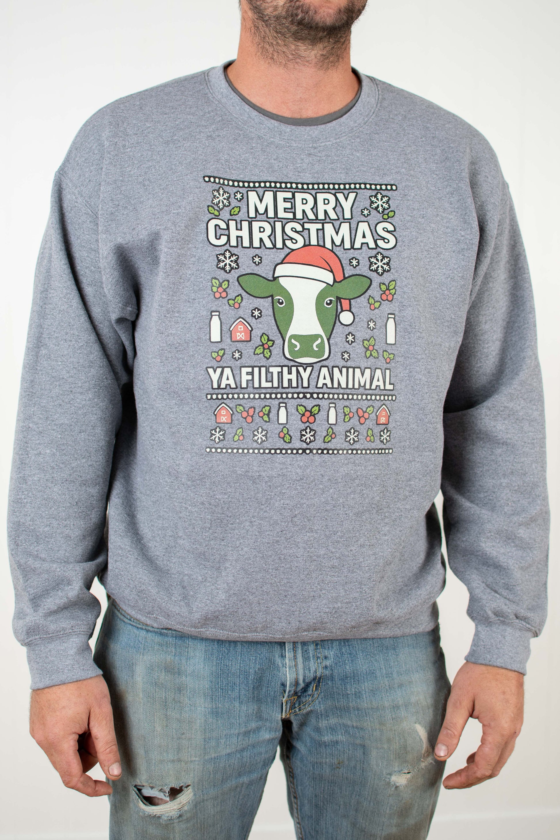 Bring holiday cheer with a playful twist in this "Merry Christmas Ya Filthy Animal" cow crewneck. Featuring a quirky cow wearing a Santa hat on a cozy graphite heather Gildan fabric, this ugly Christmas sweater-inspired graphic sweater is perfect for festive fun and cozy comfort all season long.