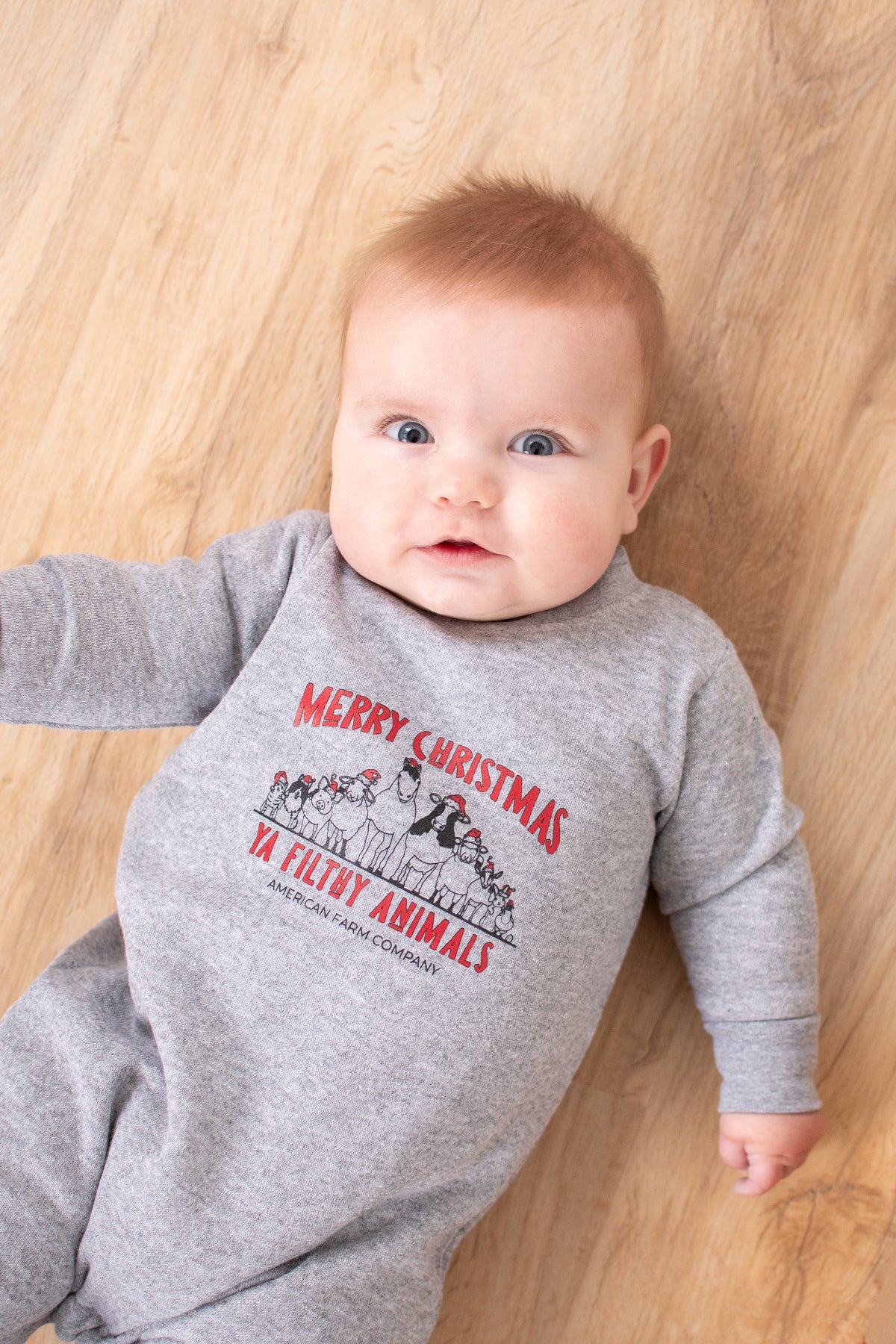 Celebrate the holidays with the ‘Merry Christmas Ya Filthy Animals’ Baby Bodysuit! Featuring a festive design and adorable farm animals dressed for the season, this best selling item is perfect for spreading cheer and keeping your little one cozy. Get ready for some jolly mischief!