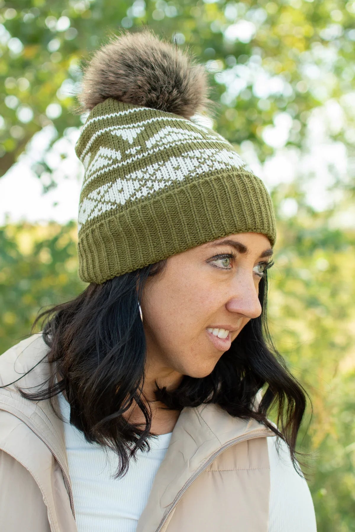 Stay cozy and stylish with the Olive & Cream Patterned Pom Hat! This playful knit hat features a charming olive and cream design, topped off with a fluffy natural faux fur pom for a fun flair. Lined with soft fleece, it keeps your head warm and comfy on chilly days. Perfect for adding a bit of whimsy to your cold-weather look!