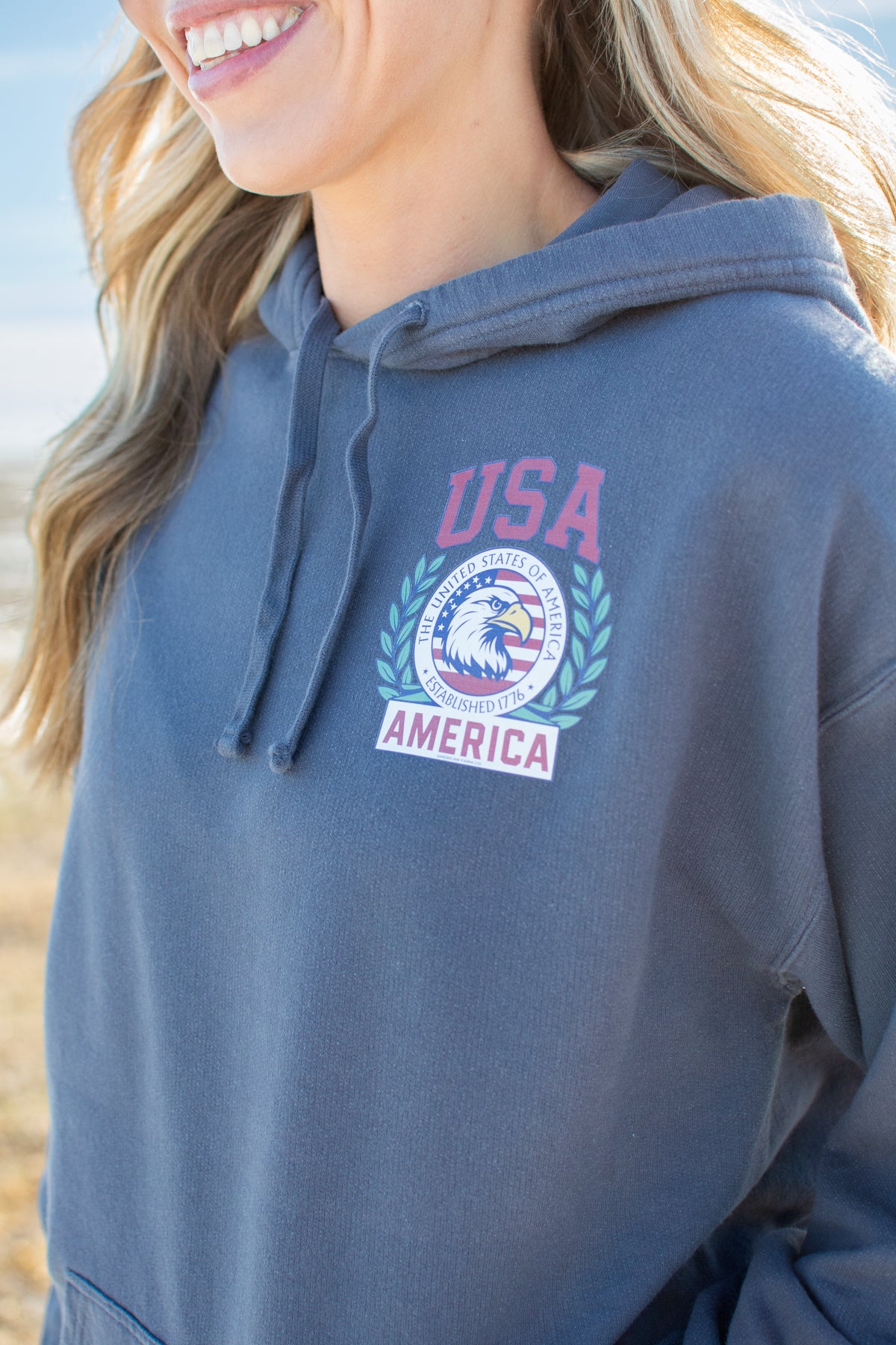 Wrap yourself in patriotic pride with this striking USA hoodie, featuring a bold bald eagle seal design in vibrant red lettering. Crafted in soft anchor slate, this comfortable pullover is treated with a gentle comfort wash for that perfectly lived-in feel. Perfect for showing your American spirit while staying cozy and casual. Whether you're heading out for the day or settling in at home, this hoodie combines eye-catching style with everyday wearability.