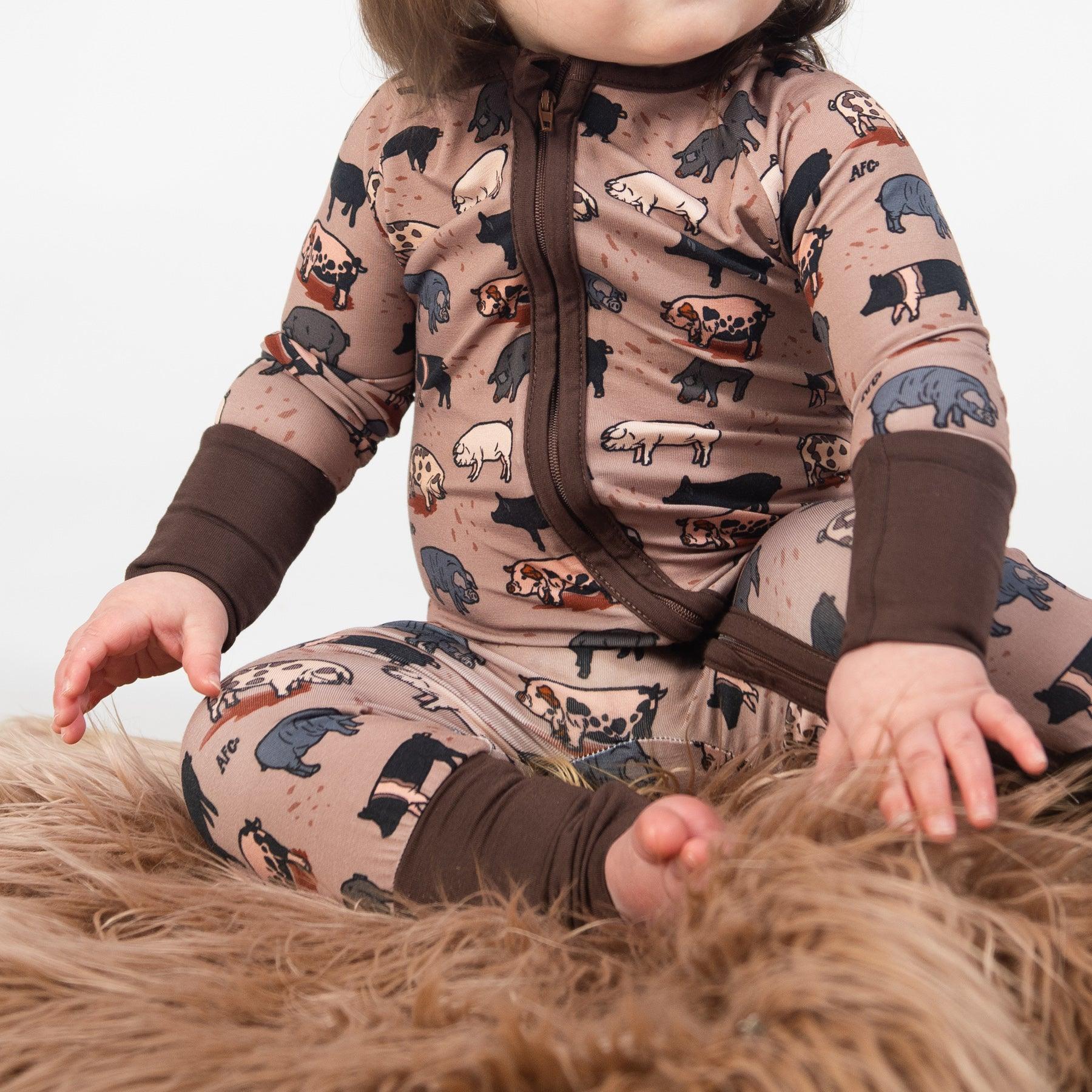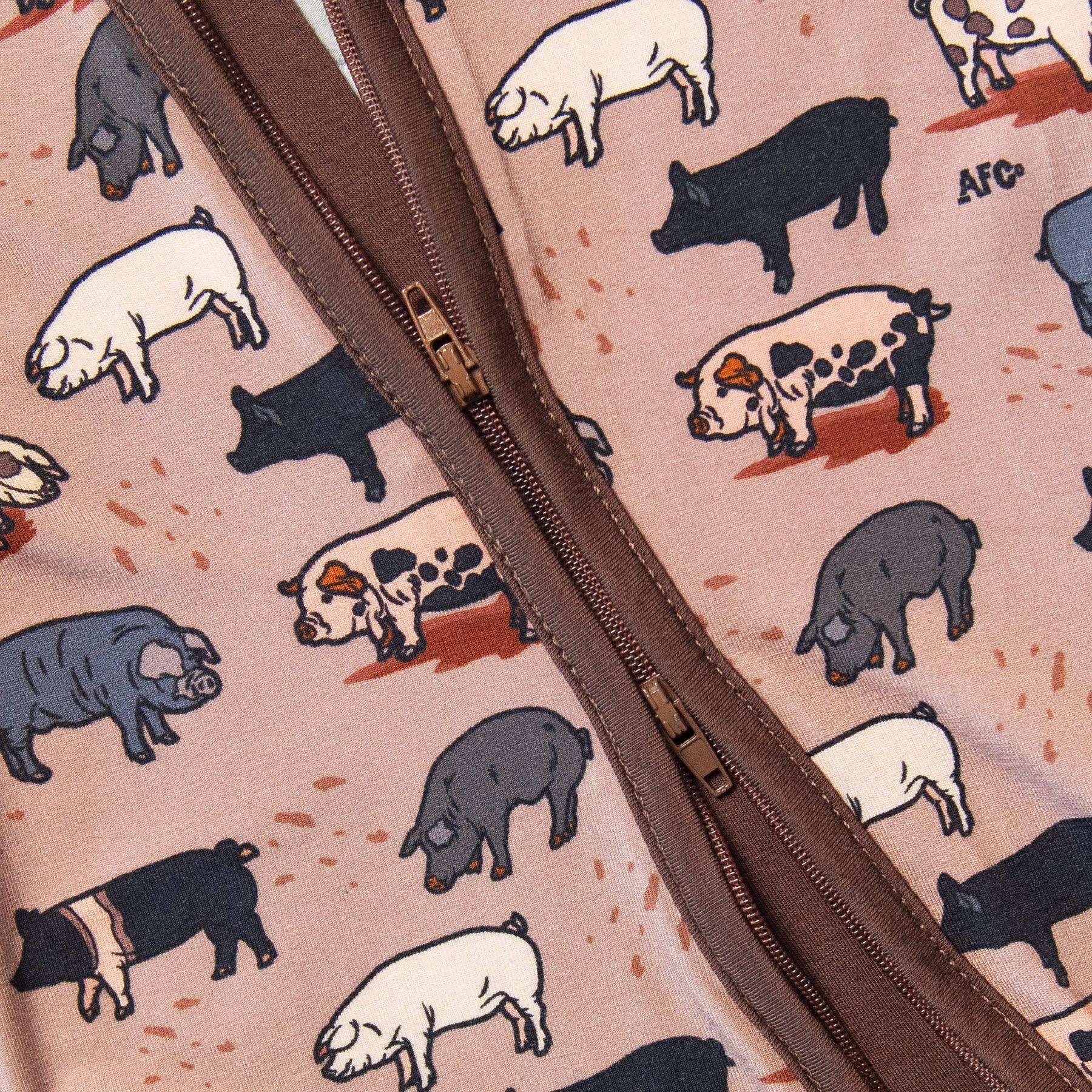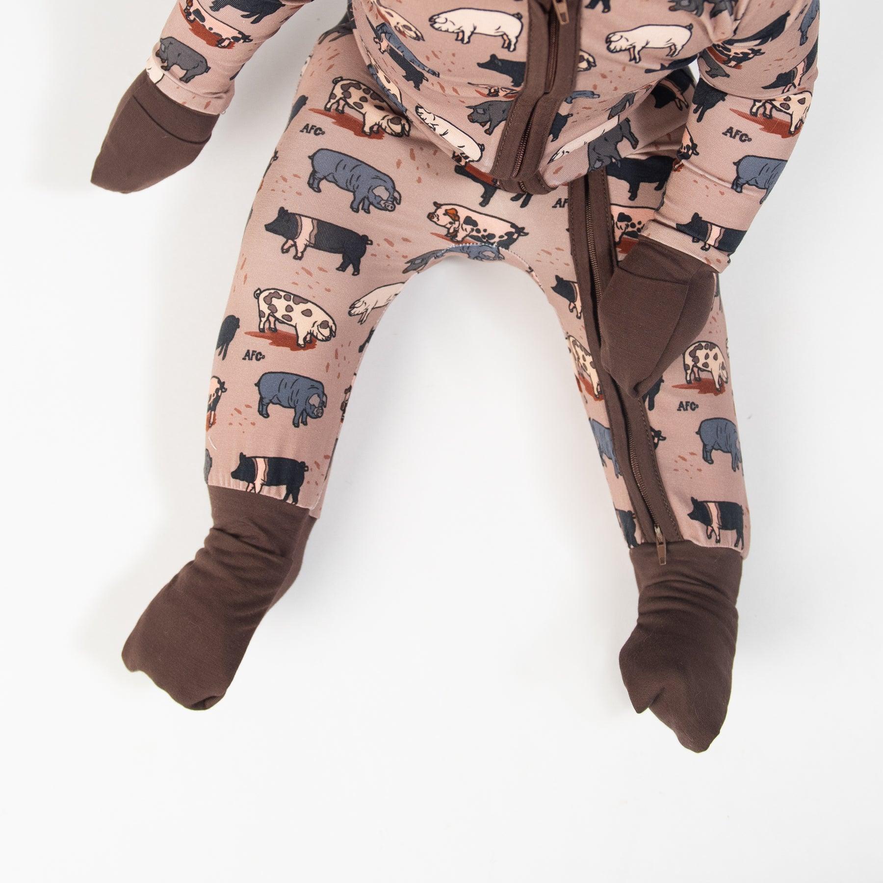 Introducing Pig Baby Bamboo Zippy - the ultimate comfort for your little one! Made with a double zipper, this one piece zippy features fold over mittens and foot cuffs to keep your baby cozy. Crafted with bamboo, it's super soft and stretchy for maximum comfort for either daytime or nighttime!