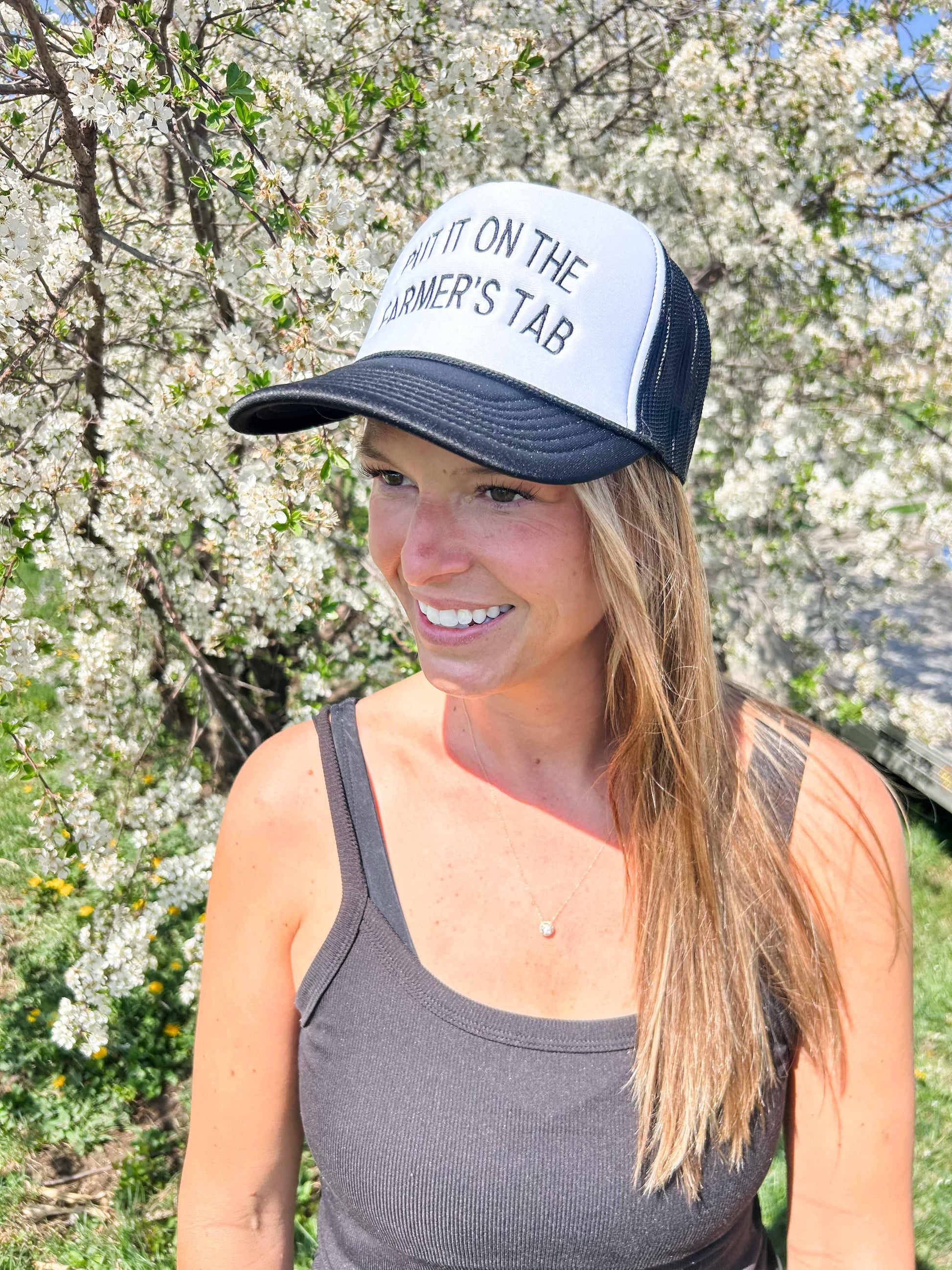 Get ready to show off your playful side with the 'Put it on the Farmer's Tab' Foam Trucker Hat - now in Black! Made with foam material and an adjustable plastic snap, this hat is not only comfortable, but also features bold black letters that add a touch of humor to your look. One size fits most, so put it on the farmer's tab and rock this hat with confidence.