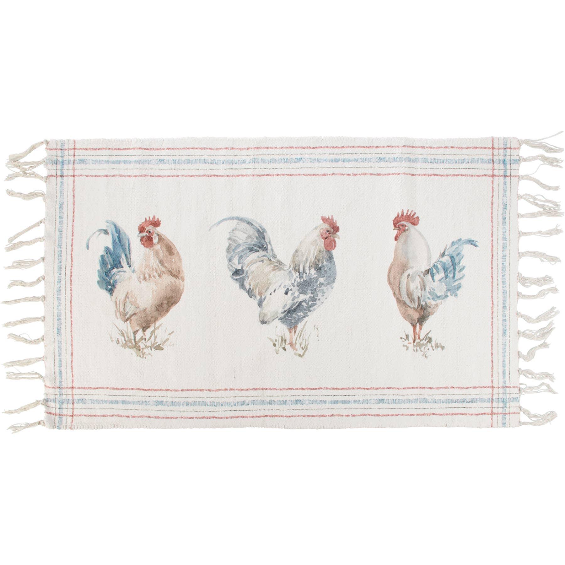 This rug displaying a Rooster Trio can be used indoor or outdoor and features skid-resistant backing to help stay in place and has tassels on the sides. A rustic everyday home accent. Spot cleaning recommended.