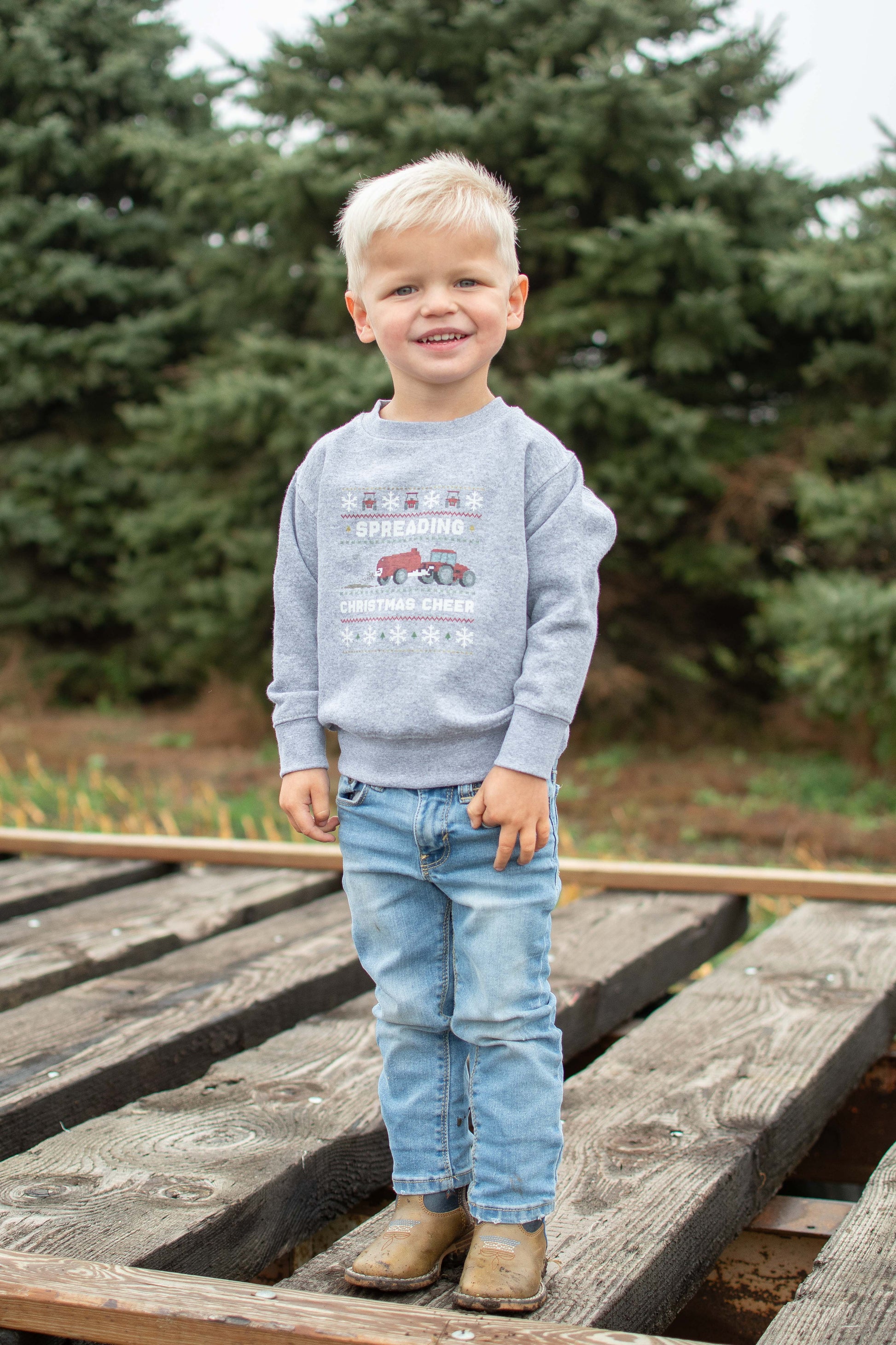 Celebrate the season with this playful "Spreading Christmas Cheer" crewneck, featuring a vibrant red tractor spreading holiday joy—the perfect design for toddlers and youth who love farming fun. Soft and cozy, it's ideal for little ones to wear while embracing the festive spirit with a touch of farmyard charm.