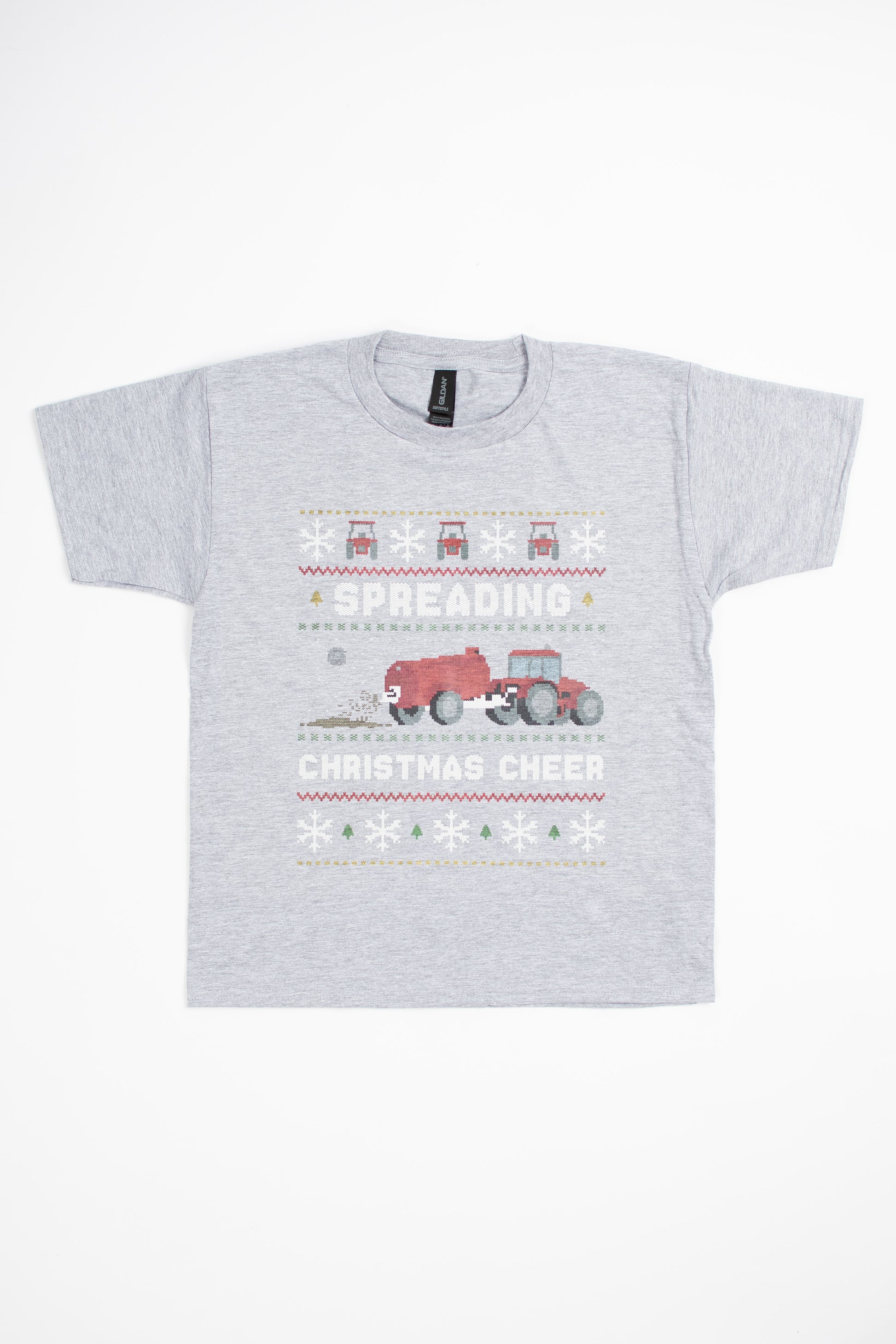 This heather grey tee for toddlers and youth features a red tractor and manure spreader, perfectly capturing the fun of spreading Christmas cheer.