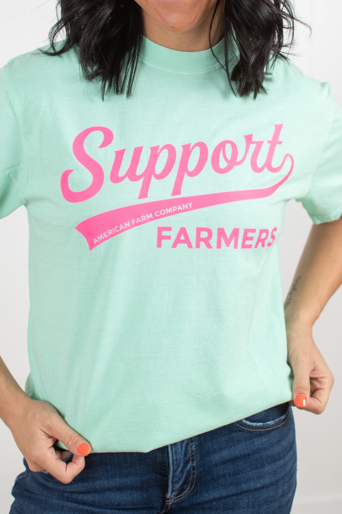 Support local agriculture in style with this vibrant mint tee featuring a bold "Support Farmers" banner design. The island reef green hue pairs perfectly with bright pink accents, creating an eye-catching look that celebrates farming communities. Crafted for comfort, this playful piece is perfect for farmers markets, casual outings, or anyone passionate about sustainable agriculture. Make a statement while staying cozy.