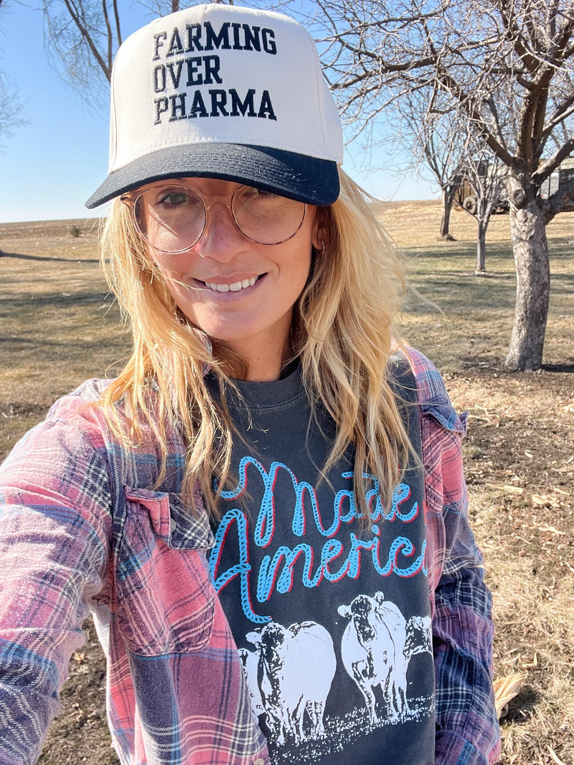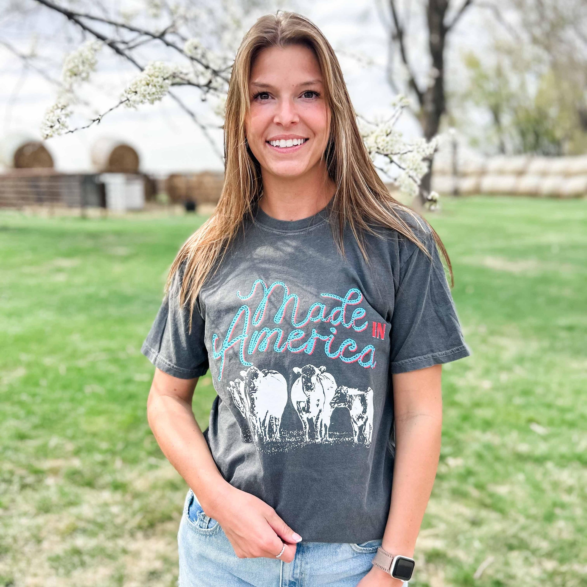 Introducing our 'Made in America' Charcoal Tee - a stylish and patriotic addition to your wardrobe! This tee features bold blue lettering in a fun rope font, a cow graphic in white, and classic red, white, and blue colors. Made with comfort in mind, this tee is made from pepper-colored comfort colors and is perfect for any casual occasion. Show your love for your country and look great while doing it with our 'Made in America' Charcoal Tee!