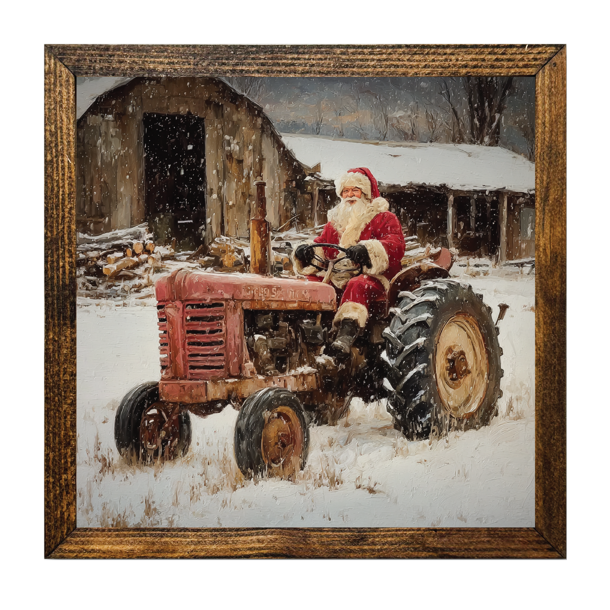 Bring holiday cheer to your space with this playful framed artwork featuring Santa joyfully driving a tractor through a snowy barn scene. Crafted with a charming wooden frame and measuring 9”x9”, it’s the perfect festive accent for any farmhouse or country-inspired decor. Celebrate the season with rustic warmth and a touch of whimsy!