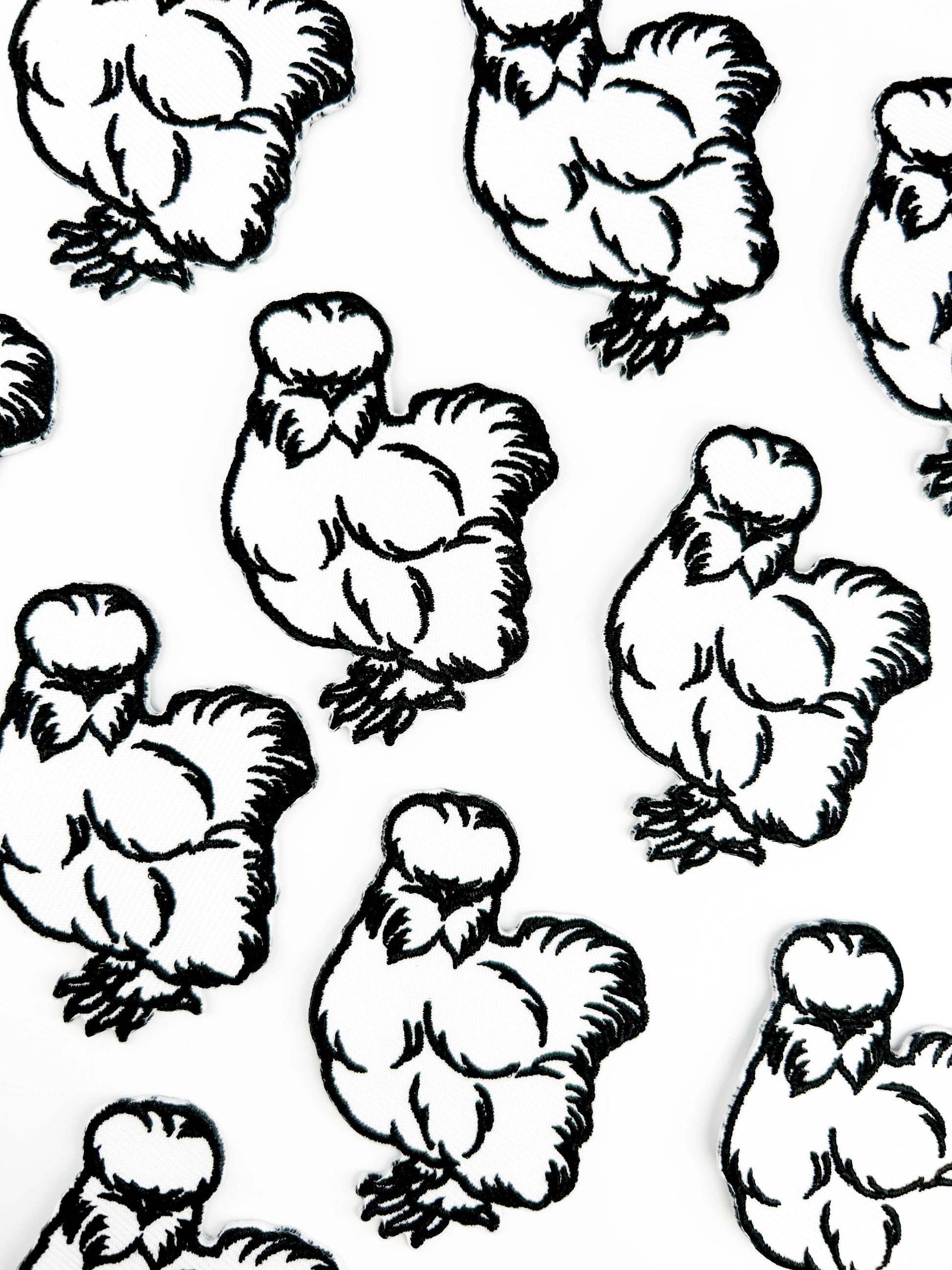 Die-cut to match the silhouette of a White Silkie Chicken with Iron-on backing